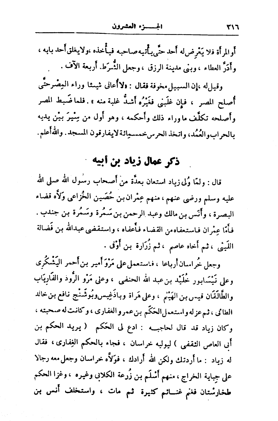 وجعل خراسان أرباعا، فاستعمل على مرو أمير بن أحمر اليشكرى وعلى نيسابور خليد بن عبد الله الحنفى، وعلى مرو الرّود والفارياب والطّالقان قيس بن الهيثم، وعلى هراة وباذغيس وبوشنج نافع بن خالد الطائى، ثم عزله واستعمل الحكم بن عمرو الغفارى، وكانت له صحبته، وكان زياد قد قال لحاجبه: ادع لى الحكم (يريد الحكم بن أبى العاص الثقفى) ليوليه خراسان، فجاء بالحكم الغفارى، فقال له زياد: ما أردتك ولكن الله أرادك، فولّاه خراسان وجعل معه رجالا على جباية الخراج، منهم أسلم بن زرعة الكلابى وغيره، وغزا الحكم طخارستان فغنم غنائم كثيرة ثم مات، واستخلف أنس بن