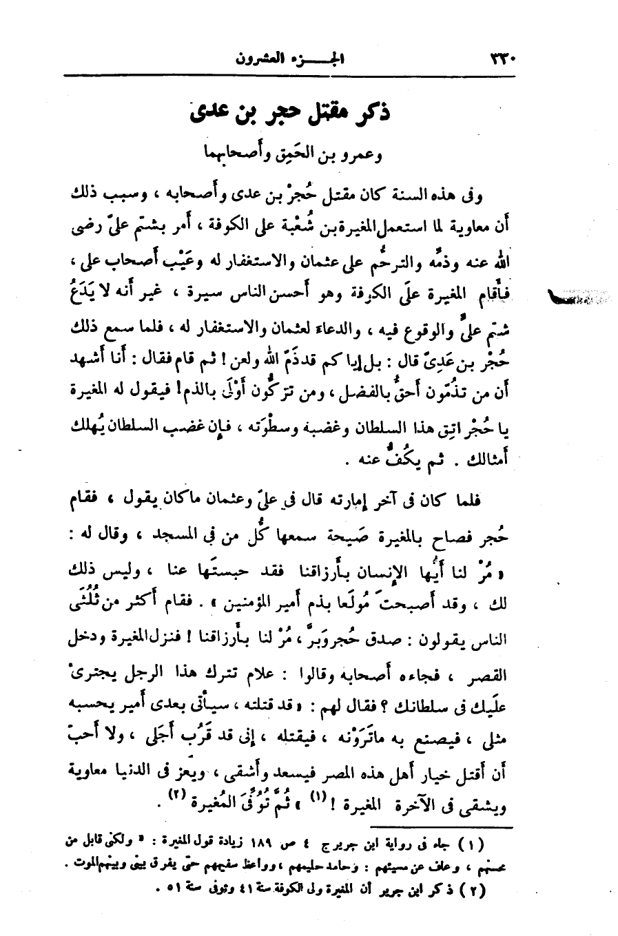 وفى هذه السنة كان مقتل حجر بن عدى وأصحابه، وسبب ذلك أن معاوية لما استعمل المغيرة بن شعبة على الكوفة، أمر بشتم علىّ رضى الله عنه وذمّه والترحّم على عثمان والاستغفار له وعيب أصحاب على، فأقام المغيرة على الكوفة وهو أحسن الناس سيرة، غير أنه لا يدع شتم علىّ والوقوع فيه، والدعاء لعثمان والاستغفار له، فلما سمع ذلك حجر بن عدىّ قال: بل إياكم قد ذمّ الله ولعن! ثم قام فقال: أنا أشهد أن من تذمّون أحقّ بالفضل، ومن تزكّون أولى بالذم! فيقول له المغيرة يا حجر اتق هذا السلطان وغضبه وسطوته، فإن غضب السلطان يهلك أمثالك. ثم يكفّ عنه.
