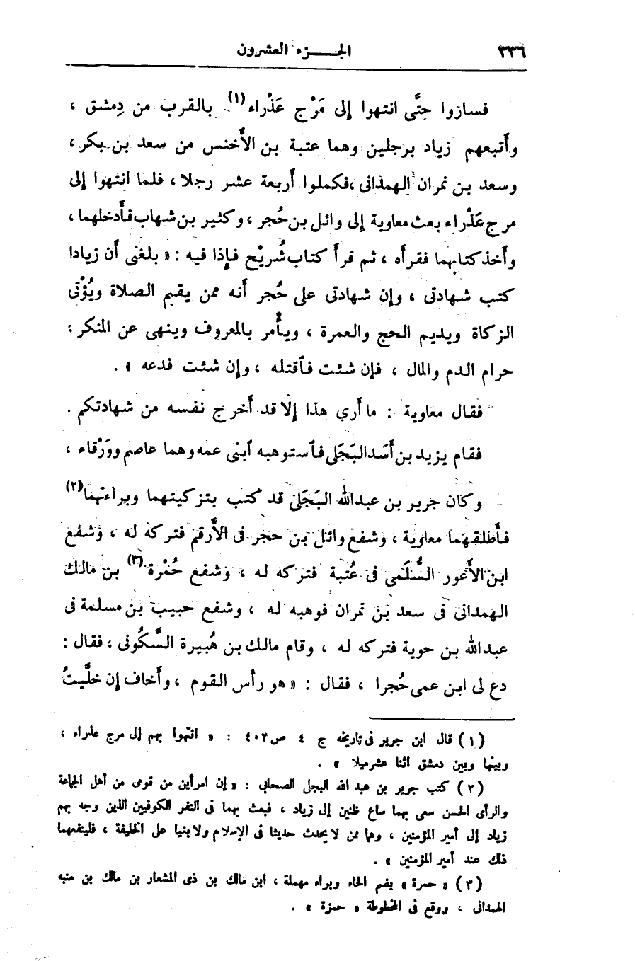 فساروا حتّى انتهوا إلى مرج عذراء [1] بالقرب من دمشق، وأتبعهم زياد برجلين وهما عتبة بن الأخنس من سعد بن بكر، وسعد بن نمران الهمدانى، فكملوا أربعة عشر رجلا، فلما انتهوا إلى مرج عذراء بعث معاوية إلى وائل بن حجر، وكثير بن شهاب فأدخلهما، وأخذ كتابهما فقرأه، ثم قرأ كتاب شريح فإذا فيه: «بلغنى أن زيادا كتب شهادتى، وإن شهادتى على حجر أنه ممن يقيم الصلاة ويؤتى الزكاة ويديم الحج والعمرة، ويأمر بالمعروف وينهى عن المنكر، حرام الدم والمال، فإن شئت فاقتله، وإن شئت فدعه» .