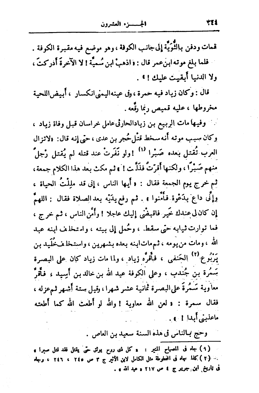 وفيها مات الربيع بن زياد الحارثى عامل خراسان قبل وفاة زياد، وكان سبب موته أنه سخط قتل حجر بن عدى، حتى إنه قال: «لا تزال العرب تقتل بعده صبرا [1] ! ولو نفرت عند قتله لم يقتل رجل منهم صبرا، ولكنها أقرّت فذلّت!» ثم مكث بعد هذا الكلام جمعة، ثم خرج يوم الجمعة فقال: «أيها الناس، إنى قد مللت الحياة، وإنّى داع بدعوة فأمّنوا» . ثم رفع يديه بعد الصلاة فقال: اللهمّ إن كان لى عندك خير فاقبضنى إليك عاجلا! وأمّن الناس، ثم خرج، فما توارت ثيابه حتى سقط، وحمل إلى بيته، واستخلف ابنه عبد الله، ومات من يومه، ثم مات ابنه بعده بشهرين، واستخلف خليد بن پربوع [2] الحنفى، فأقرّه زياد، ولما مات زياد كان على البصرة سمرة بن جندب، وعلى الكوفة عبد الله بن خالد بن أسيد، فأقرّ معاوية سمرة على البصرة ثمانية عشر شهرا، وقيل ستة أشهر ثم عزله، فقال سمرة: «لعن الله معاوية! والله لو أطعت الله كما أطعته ما عذبنى أبدا!» .
