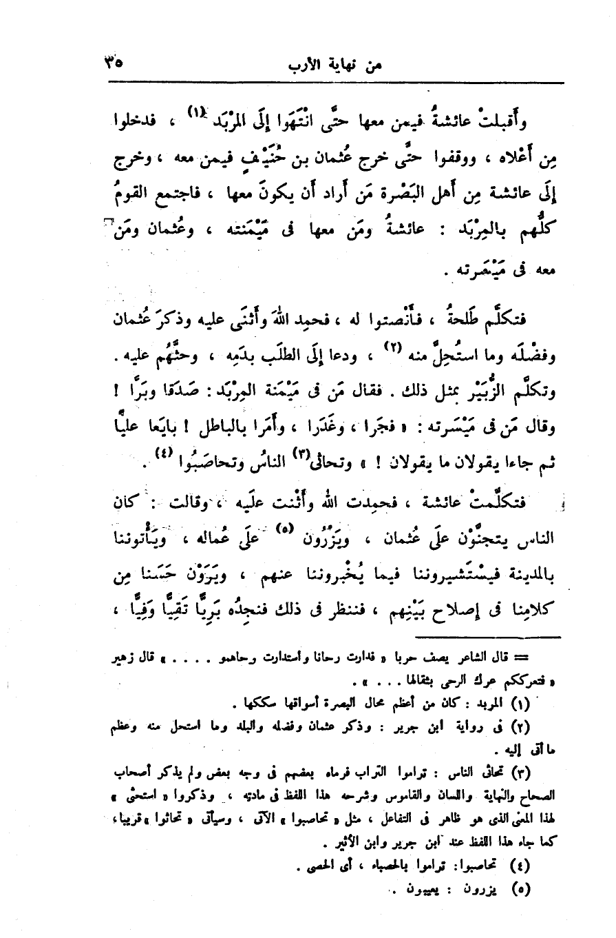 فتكلّمت عائشة، فحمدت الله وأثنت عليه، وقالت: كان الناس يتجنّون على عثمان، ويزرون [5] على عماله، ويأتوننا بالمدينة فيستشيروننا فيما يخبروننا عنهم، ويرون حسنا من كلامنا فى إصلاح بينهم، فننظر فى ذلك فنجده بريّا تقيّا وفيّا،