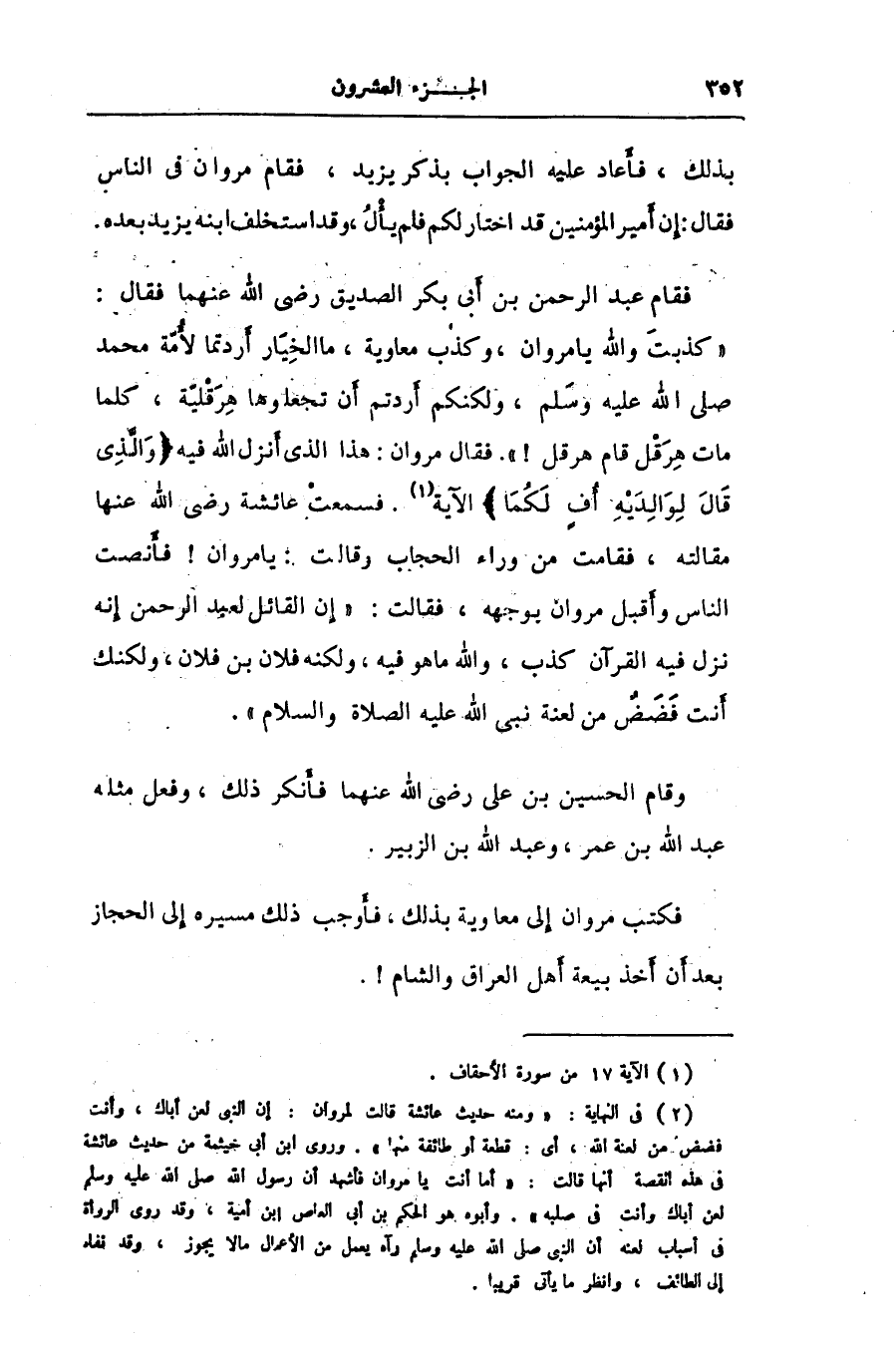 «كذبت والله يا مروان، وكذب معاوية، ما الخيّار أردتما لأمّة محمد صلى الله عليه وسلم، ولكنكم أردتم أن تجعلوها هرقليّة، كلما مات هرقل قام هرقل!» . فقال مروان: هذا الذى أنزل الله فيه وَالَّذِي قالَ لِوالِدَيْهِ أُفٍّ لَكُما
