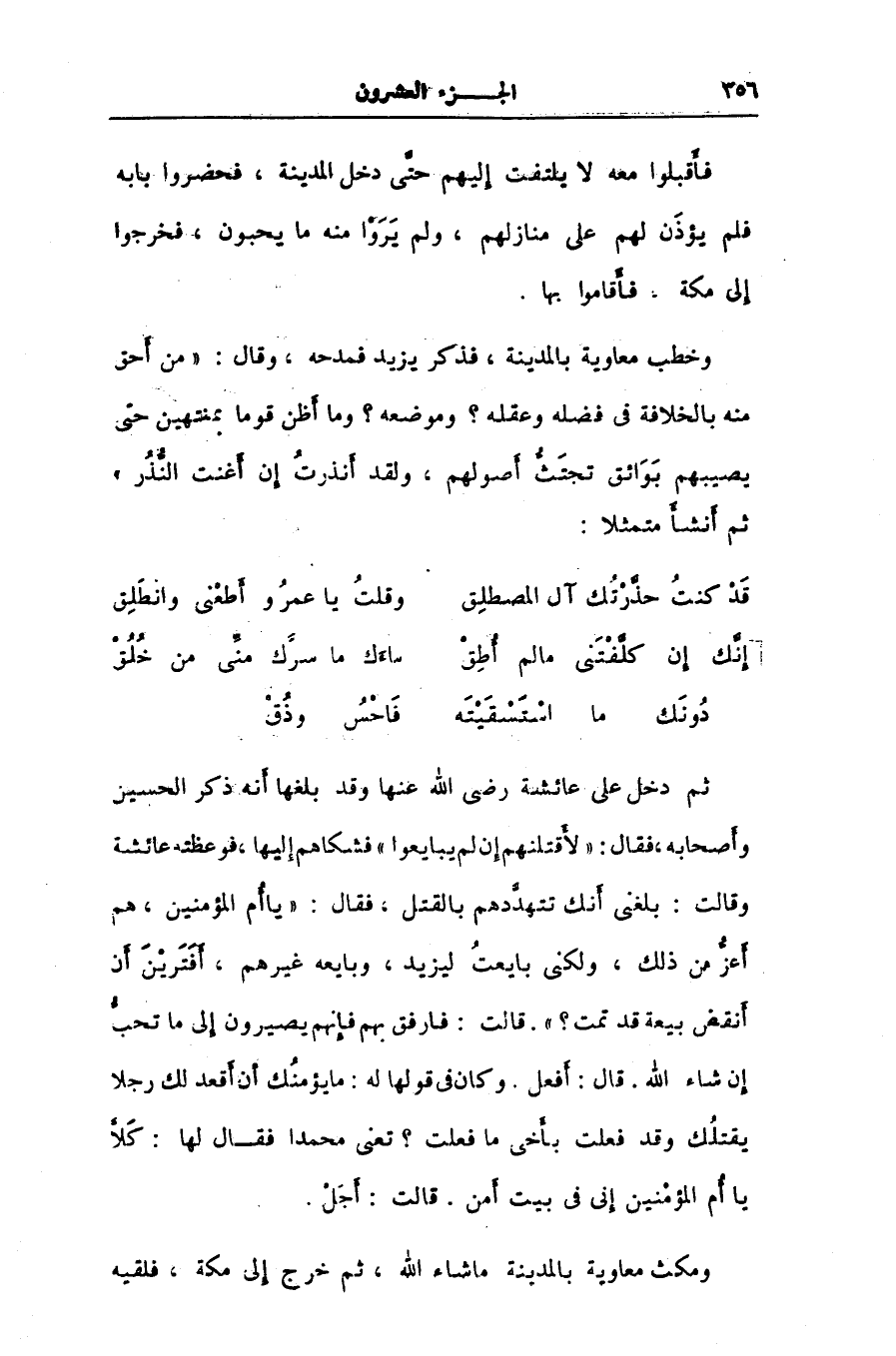 دونك ما استسقيته فاحس وذق ثم دخل على عائشة رضى الله عنها وقد بلغها أنه ذكر الحسين وأصحابه، فقال: «لأقتلنهم إن لم يبايعوا» فشكاهم إليها، فوعظته عائشة وقالت: بلغنى أنك تتهدّدهم بالقتل، فقال: «يا أم المؤمنين، هم أعزّ من ذلك، ولكنى بايعت ليزيد، وبايعه غيرهم، أفترين أن أنقض بيعة قد تمت؟» . قالت: فارفق بهم فإنهم يصيرون إلى ما تحبّ إن شاء الله. قال: أفعل. وكان فى قولها له: ما يؤمنك أن أقعد لك رجلا يقتلك وقد فعلت بأخى ما فعلت؟ تعنى محمدا فقال لها: كلّا يا أم المؤمنين إنى فى بيت أمن. قالت: أجل.