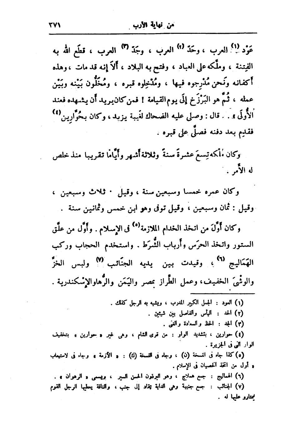 وكان أوّل من اتخذ الخدام الملازمة [5] فى الإسلام. وأوّل من علّق الستور واتخذ الحرس وأرباب الشّرط. واستخدم الحجاب وركب الهماليج [6] ، وقيدت بين يديه الجنائب [7] ولبس الخزّ والوشى الخفيف، وعمل الطّراز بمصر واليمن والرّها والإسكندرية.