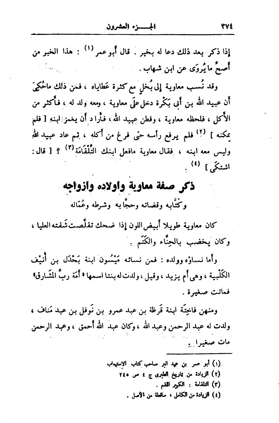 وقد نسب معاوية إلى بخل مع كثرة عطاياه، فمن ذلك ما حكى أن عبيد الله بن أبى بكرة دخل على معاوية، ومعه ولد له، فأكثر من الأكل، فلحظه معاوية، وفطن عبيد الله، فأراد أن يغمز ابنه [فلم يمكنه] [2] فلم يرفع رأسه حتى فرغ من أكله، ثم عاد عبيد الله وليس معه ابنه، فقال معاوية ما فعل ابنك التّلقامة [3] ؟ [قال: