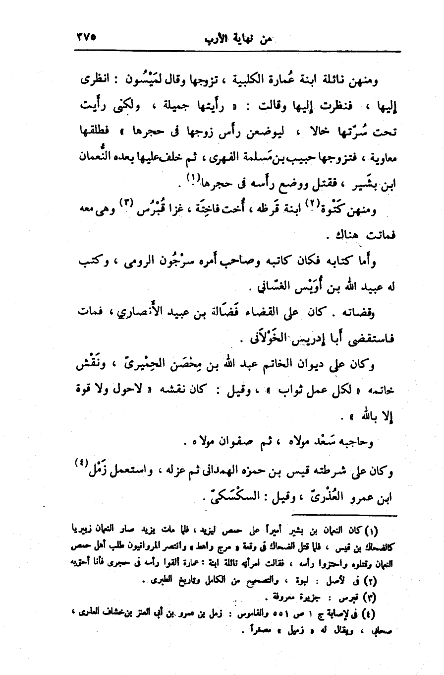 [1] كان النعمان بن بشير أميرا على حمص ليزيد، فلما مات يزيد صار النعمان زبير يا كالضحاك بن قيس، فلما قتل الضحاك فى وقعة «مرج راهط» وانتصر المروانيون طلب أهل حمص النعمان وقتلوه واحتزوا رأسه، فقالت امرأته نائلة ابنة: عمارة ألقوا رأسه فى حجرى فأنا أحق به