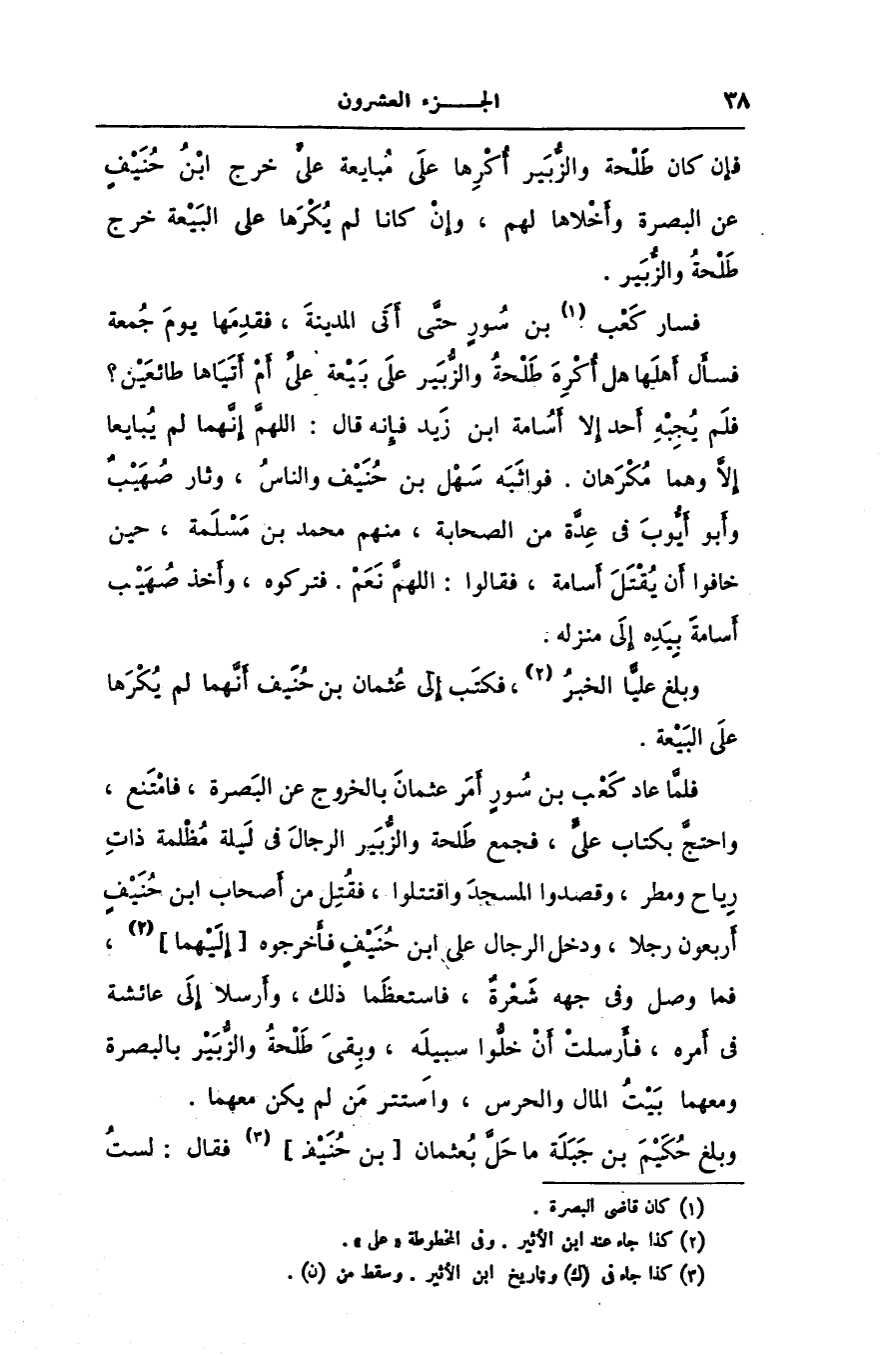 فإن كان طلحة والزّبير أكرها على مبايعة علىّ خرج ابن حنيف عن البصرة وأخلاها لهم، وإن كانا لم يكرها على البيعة خرج طلحة والزّبير.