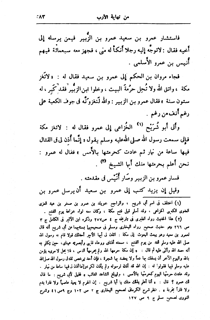 فقيل لأبى شريح: ما قال لك عمرو؟ قال: «أنا أعلم بذلك منك يا أبا شريح. إن الحرم لا يعيذ عاصيا ولا فارا بدم ولا فارا بخربة» . انظر شرح الكرمانى لصحيح البخارى ج 2 ص 102 وج 9 ص 41 وشرح النووى لصحيح مسلم ج 9 ص 127.