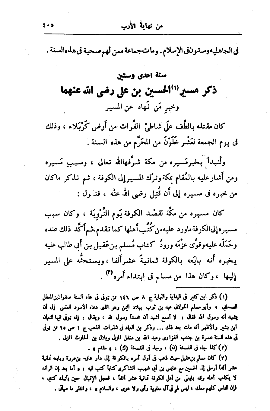 ولنبدأ بخبر مسيره من مكة شرّفها الله تعالى، وسبب مسيره ومن أشار عليه بالمقام بمكة وترك المسير إلى الكوفة، ثم نذكر ما كان من خبره فى مسيره إلى أن قتل رضى الله عنه، فنقول: