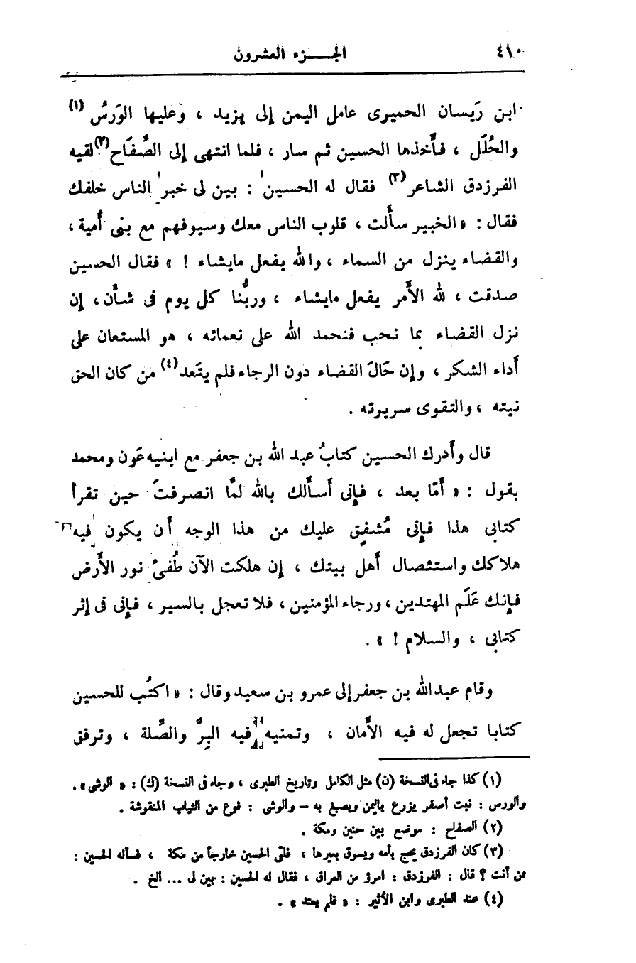 قال وأدرك الحسين كتاب عبد الله بن جعفر مع ابنيه عون ومحمد يقول: «أمّا بعد، فإنى أسألك بالله لمّا انصرفت حين تقرأ كتابى هذا فإنى مشفق عليك من هذا الوجه أن يكون فيه هلاكك واستئصال أهل بيتك، إن هلكت الآن طفئ نور الأرض فإنك علم المهتدين، ورجاء المؤمنين، فلا تعجل بالسير، فإنى فى إثر كتابى، والسلام!» .