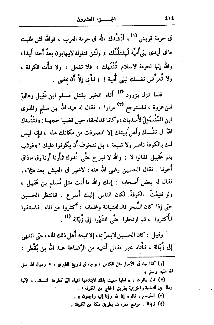 فلما نزل بزرود [2] أتاه الخبر بقتل مسلم ابن عقيل وهانئ ابن عروة، فاسترجع [3] مرارا، فقال له عبد الله بن سليم والمذرى ابن المشمعلّ الأسديان، وكانا قد لحقاه حين قضيا حجهما: «ننشدك الله فى نفسك وأهل بيتك إلا انصرفت من مكانك هذا، فإنه ليس لك بالكوفة ناصر ولا شيعة، بل نتخوف أن يكونوا عليك!» فوثب بنو عقيل فقالوا لا: والله لا نبرح حتّى ندرك ثأرنا أو نذوق ما ذاق أخونا. فقال الحسين رضى الله عنه: لا خير فى العيش بعد هؤلاء، فقال له بعض أصحابه: إنك والله ما أنت مثل مسلم بن عقيل، ولو قدمت الكوفة لكان الناس إليك أسرع. فانتظر الحسين حتى إذا كان السّحر قال لفتيانة وغلمانه: أكثروا من الماء. فاستقوا فأكثروا، ثم ارتحلوا حتّى انتهوا إلى زبالة [4] .