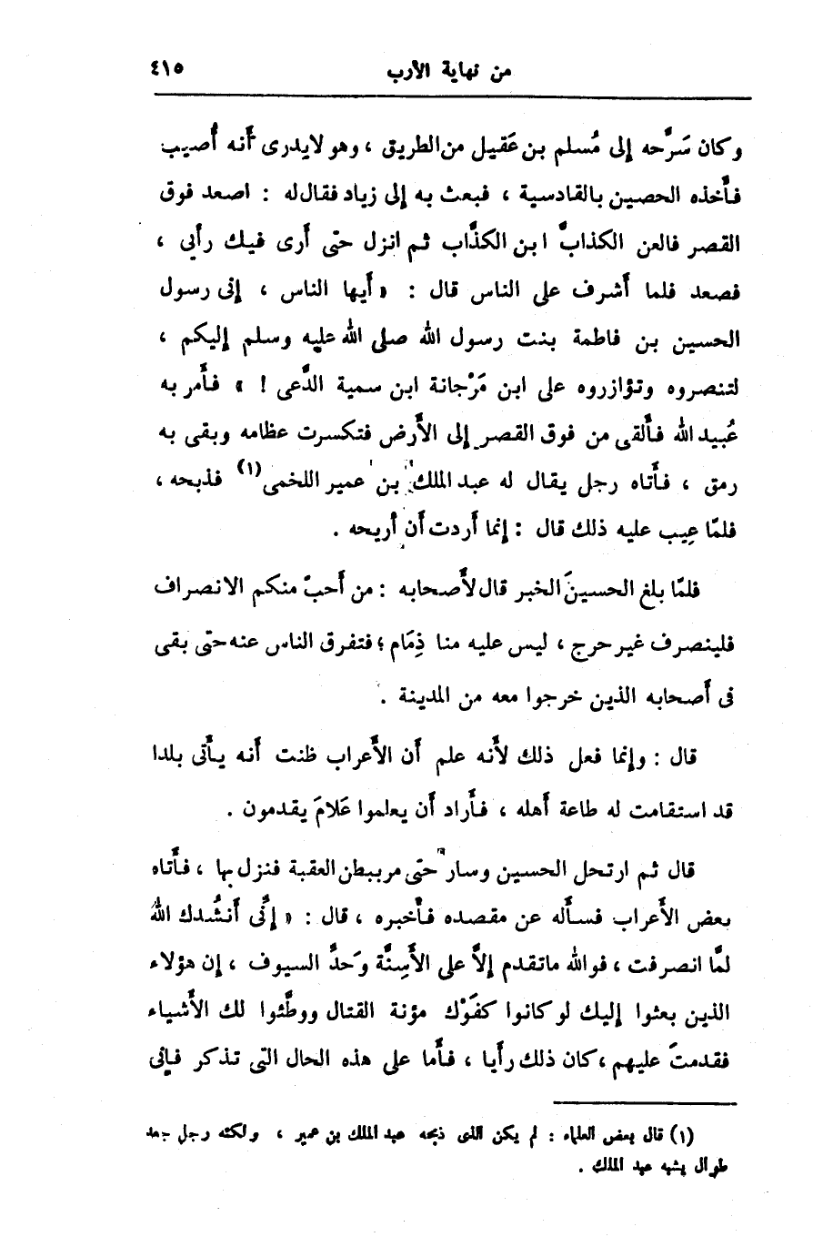 وكان سرّحه إلى مسلم بن عقيل من الطريق، وهو لا يدرى أنه أصيب فأخذه الحصين بالقادسية، فبعث به إلى زياد فقال له: اصعد فوق القصر فالعن الكذابّ ابن الكذّاب ثم انزل حتى أرى فيك رأيى، فصعد فلما أشرف على الناس قال: «أيها الناس، إنى رسول الحسين بن فاطمة بنت رسول الله صلى الله عليه وسلم إليكم، لتنصروه وتؤازروه على ابن مرجانة ابن سمية الدّعى!» فأمر به عبيد الله فألقى من فوق القصر إلى الأرض فتكسرت عظامه وبقى به رمق، فأتاه رجل يقال له عبد الملك بن عمير اللخمى [1] فذبحه، فلمّا عيب عليه ذلك قال: إنما أردت أن أريحه.