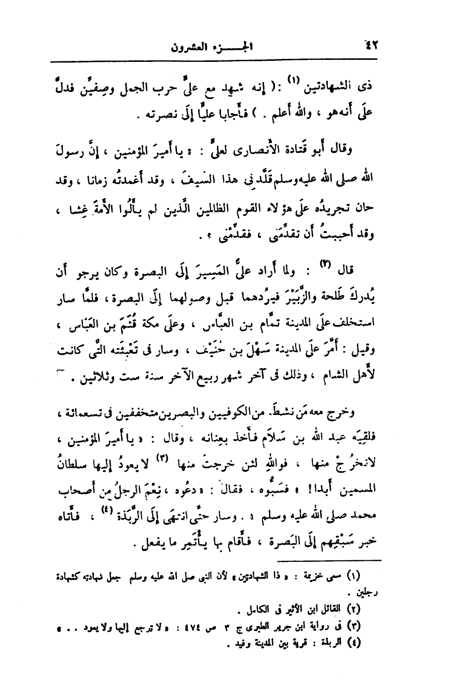 ذى الشهادتين [1] : (إنه شهد مع علىّ حرب الجمل وصفّين فدلّ على أنه هو، والله أعلم.) فأجابا عليّا إلى نصرته.