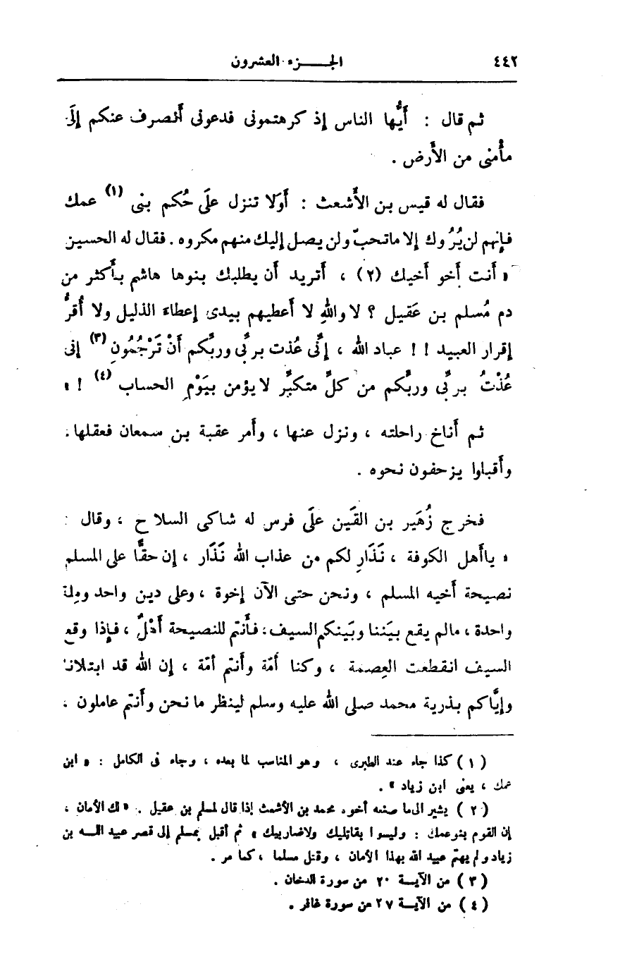 فقال له قيس بن الأشعث: أولا تنزل على حكم بنى [1] عمك فإنهم لن يروك إلا ما تحبّ ولن يصل إليك منهم مكروه. فقال له الحسين «أنت أخو أخيك [2] ، أتريد أن يطلبك بنوها هاشم بأكثر من دم مسلم بن عقيل؟ لا والله لا أعطيهم بيدى إعطاء الذليل ولا أقرّ إقرار العبيد!! عباد الله، إنّى عذت بربّى وربّكم أن ترجمون [3] إنى عذت بربّى وربّكم من كلّ متكبّر لا يؤمن بيوم الحساب [4] ! ثم أناخ راحلته، ونزل عنها، وأمر عقبة بن سمعان فعقلها.