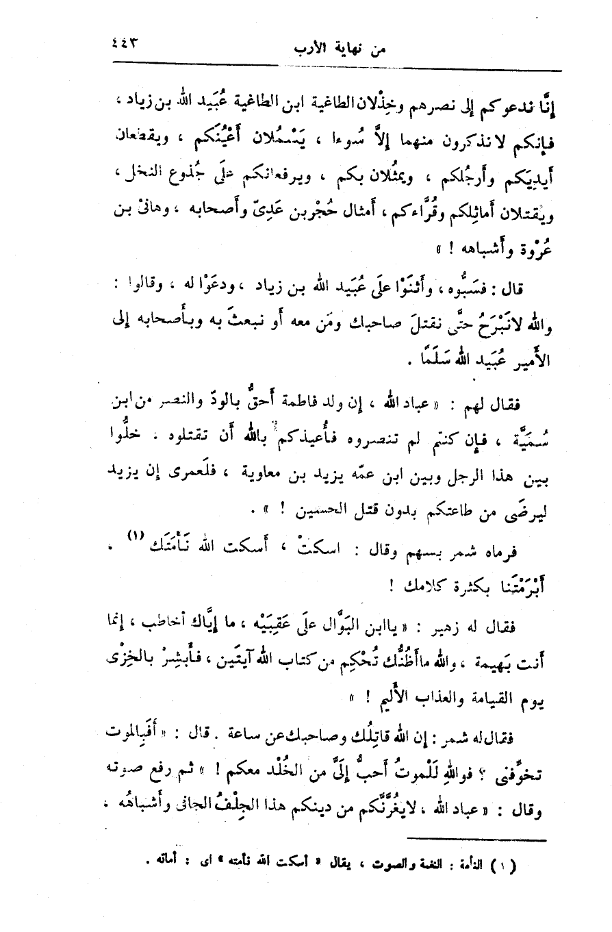 إنّا ندعوكم إلى نصرهم وخذلان الطاغية ابن الطاغية عبيد الله بن زياد، فإنكم لا نذكرون منهما إلّا سوءا، يسملان أعينكم، ويقطعان أيديكم وأرجلكم، ويمثلان بكم، ويرفعانكم على جذوع النخل، ويقتلان أماثلكم وقرّاءكم، أمثال حجر بن عدىّ وأصحابه، وهانئ بن عروة وأشباهه!» قال: فسبّوه، وأثنوا على عبيد الله بن زياد، ودعوا له، وقالوا: