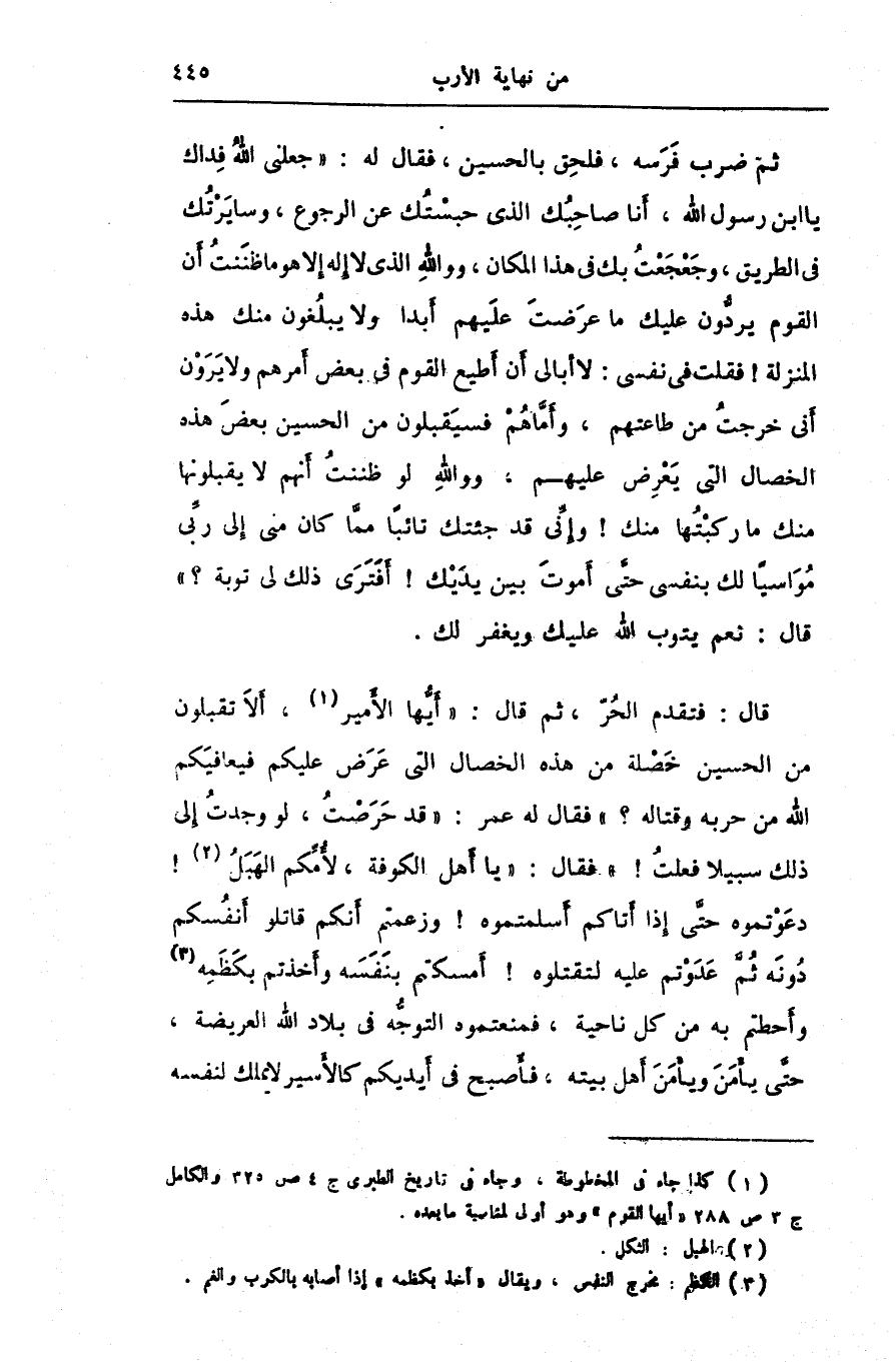 قال: فتقدم الحرّ، ثم قال: «أيّها الأمير [1] ، ألا تقبلون من الحسين خصلة من هذه الخصال التى عرض عليكم فيعافيكم الله من حربه وقتاله؟» فقال له عمر: «قد حرصت، لو وجدت إلى ذلك سبيلا فعلت!» فقال: «يا أهل الكوفة، لأمّكم الهبل [2] ! دعوتموه حتّى إذا أتاكم أسلمتموه! وزعمتم أنكم قاتلو أنفسكم دونه ثمّ عدوتم عليه لتقتلوه! أمسكتم بنفسه وأخذتم بكظمه [3] وأحطتم به من كل ناحية، فمنعتموه التوجّه فى بلاد الله العريضة، حتّى يأمن ويأمن أهل بيته، فأصبح فى أيديكم كالأسير لا يملك لنفسه