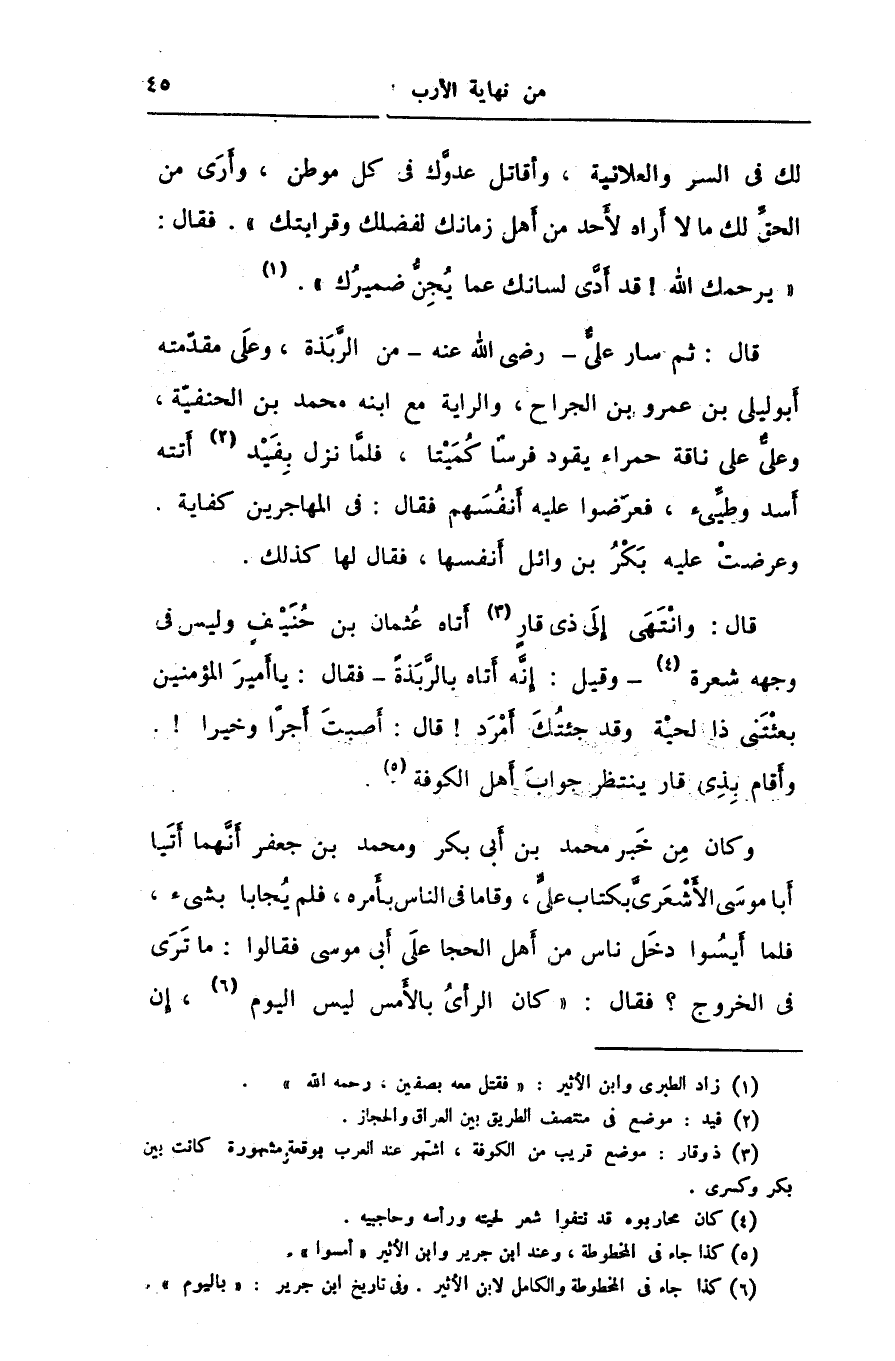 قال: ثم سار علىّ- رضى الله عنه- من الرّبذة، وعلى مقدّمته أبو ليلى بن عمرو بن الجراح، والراية مع ابنه محمد بن الحنفيّة، وعلىّ على ناقة حمراء يقود فرسا كميتا، فلمّا نزل بفيد [2] أتته أسد وطيّىء، فعرّضوا عليه أنفسهم فقال: فى المهاجرين كفاية.