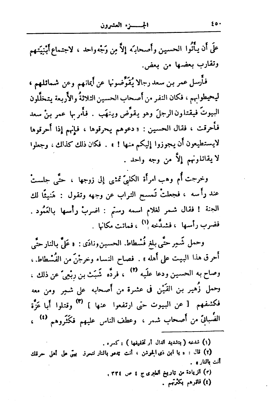 وحمل شمر حتّى بلغ فسطاط الحسين ونادى: «علىّ بالنار حتّى أحرق هذا البيت على أهله» . فصاح النساء وخرجن من الفسطاط، وصاح به الحسين ودعا عليه [2] ، فردّه شبث بن ربعىّ عن ذلك، وحمل زهير بن القين فى عشرة من أصحابه على شمر ومن معه فكشفهم [عن البيوت حتى ارتفعوا عنها] [3] وقتلوا أبا عزّة الضّبابىّ من أصحاب شمر، وعطف الناس عليهم فكثروهم [4] ،
