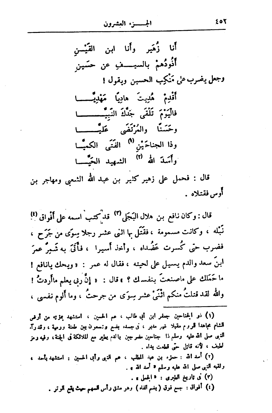 [1] ذو الجناحين جعفر ابن أبى طالب، عم الحسين، استشهد بمؤته من أرض الشام مجاهدا للروم مقبلا غير مدبر، فى جسده بضع وتسعون بين طعنة ورمية، وقد رآه النبى صلى الله عليه وسلم ذا جناحين مضرجين بالدم يطير مع الملائكة فى الجنة، وفيه رمز لطيف، لأنه قاتل حتى قطعت يداه.