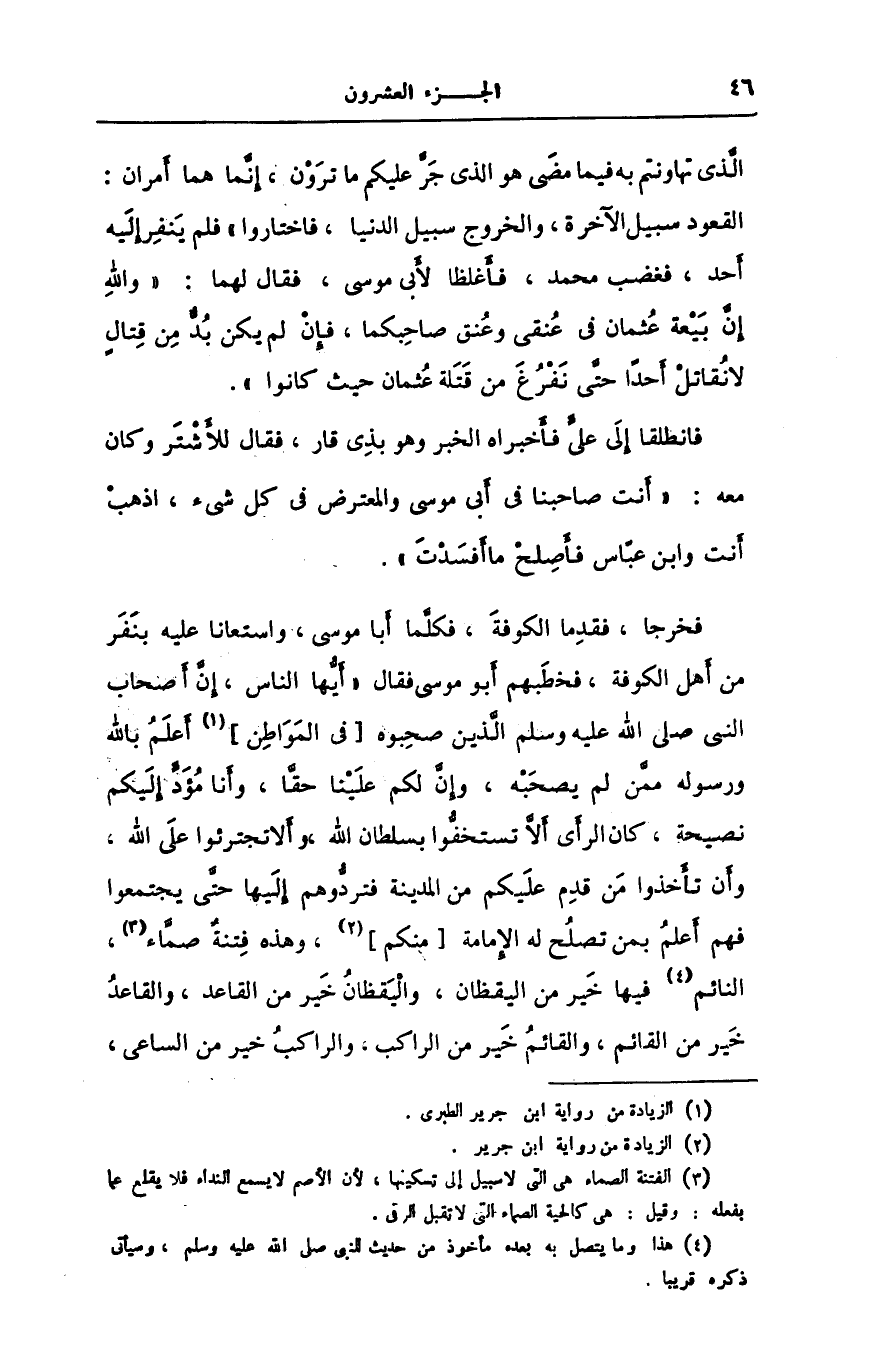 فخرجا، فقدما الكوفة، فكلّما أبا موسى، واستعانا عليه بنفر من أهل الكوفة، فخطبهم أبو موسى فقال «أيّها الناس، إنّ أصحاب النبى صلى الله عليه وسلم الّذين صحبوه [فى المواطن] [1] أعلم بالله ورسوله ممّن لم يصحبه، وإنّ لكم علينا حقّا، وأنا مؤدّ إليكم نصيحة، كان الرأى ألّا تستخفّوا بسلطان الله، وألا تجترئوا على الله، وأن تأخذوا من قدم عليكم من المدينة فتردّوهم إليها حتّى يجتمعوا فهم أعلم بمن تصلح له الإمامة [منكم] [2] ، وهذه فتنة صمّاء [3] ، النائم [4] فيها خير من اليقظان، واليقظان خير من القاعد، والقاعد خير من القائم، والقائم خير من الراكب، والراكب خير من الساعى،