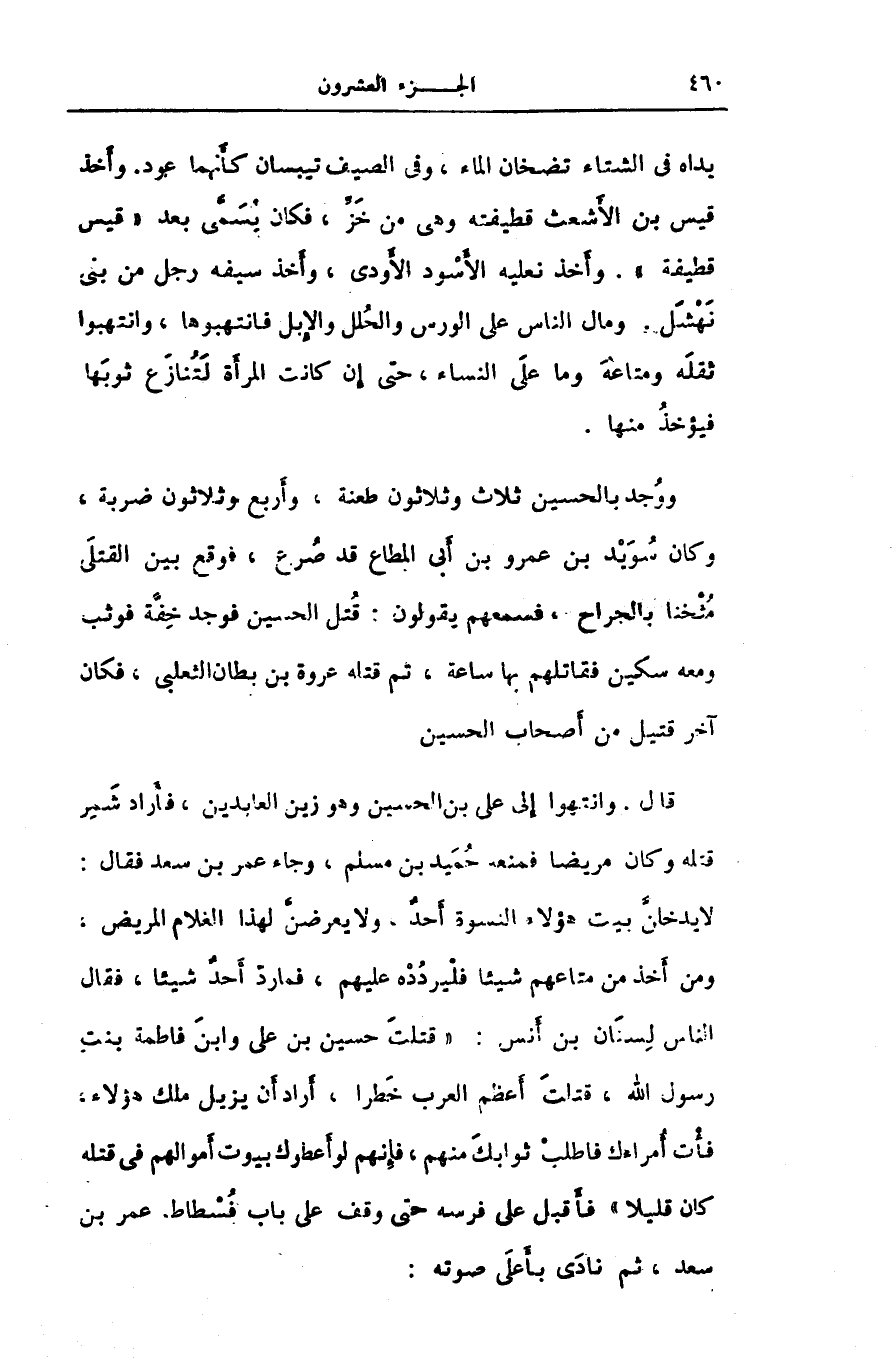 يداه فى الشتاء تضخان الماء، وفى الصيف تيبسان كأنهما عود. وأخذ قيس بن الأشعث قطيفته وهى من خزّ، فكان يسمّى بعد «قيس قطيفة» . وأخذ نعليه الأسود الأودى، وأخذ سيفه رجل من بنى نهشل. ومال الناس على الورس والحلل والإبل فانتهبوها، وانتهبوا ثقله ومتاعه وما على النساء، حتى إن كانت المرأة لتنازع ثوبها فيؤخذ منها.
