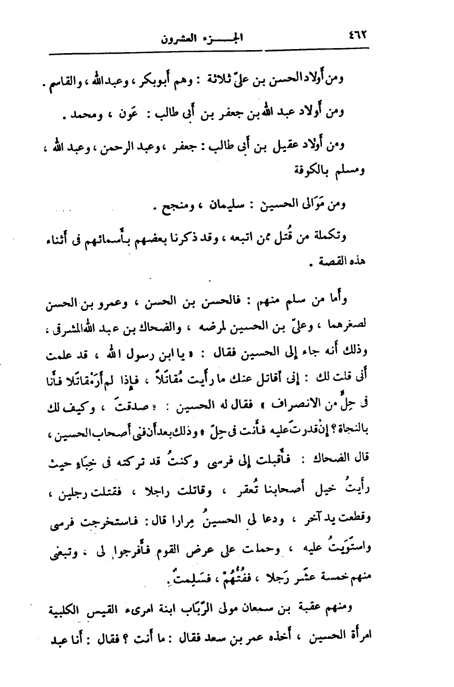 وأما من سلم منهم: فالحسن بن الحسن، وعمرو بن الحسن لصغرهما، وعلىّ بن الحسين لمرضه، والضحاك بن عبد الله المشرقى، وذلك أنه جاء إلى الحسين فقال: «يا ابن رسول الله، قد علمت أنى قلت لك: إنى أقاتل عنك ما رأيت مقاتلا، فإذا لم أر مقاتلا فأنا فى حلّ من الانصراف» فقال له الحسين: «صدقت، وكيف لك بالنجاة؟ إن قدرت عليه فأنت فى حلّ» وذلك بعد أن فنى أصحاب الحسين، قال الضحاك: فأقبلت إلى فرسى وكنت قد تركته فى خباء حيث رأيت خيل أصحابنا تعقر، وقاتلت راجلا، فقتلت رجلين، وقطعت يد آخر، ودعا لى الحسين مرارا قال: فاستخرجت فرسى واستويت عليه، وحملت على عرض القوم فأفرجوا لى، وتبعنى منهم خمسة عشر رجلا، ففتّهم، فسلمت.