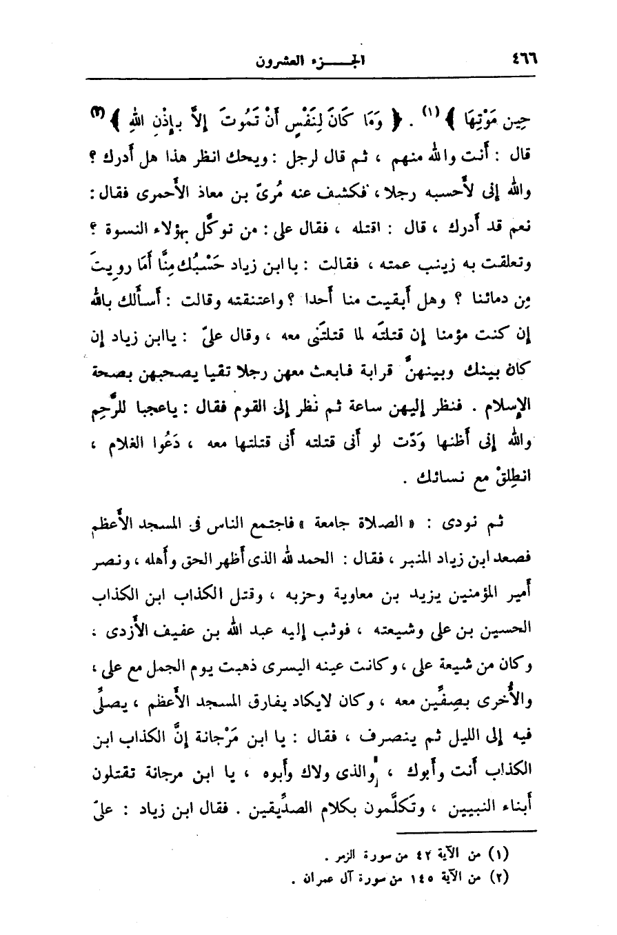 ثم نودى: «الصلاة جامعة» فاجتمع الناس فى المسجد الأعظم فصعد ابن زياد المنبر، فقال: الحمد لله الذى أظهر الحق وأهله، ونصر أمير المؤمنين يزيد بن معاوية وحزبه، وقتل الكذاب ابن الكذاب الحسين بن على وشيعته، فوثب إليه عبد الله بن عفيف الأزدى، وكان من شيعة على، وكانت عينه اليسرى ذهبت يوم الجمل مع على، والأخرى بصفّين معه، وكان لا يكاد يفارق المسجد الأعظم، يصلّى فيه إلى الليل ثم ينصرف، فقال: يا ابن مرجانة إنّ الكذاب ابن الكذاب أنت وأبوك، والذى ولاك وأبوه، يا ابن مرجانة تقتلون أبناء النبيين، وتكلّمون بكلام الصدّيقين. فقال ابن زياد: علىّ