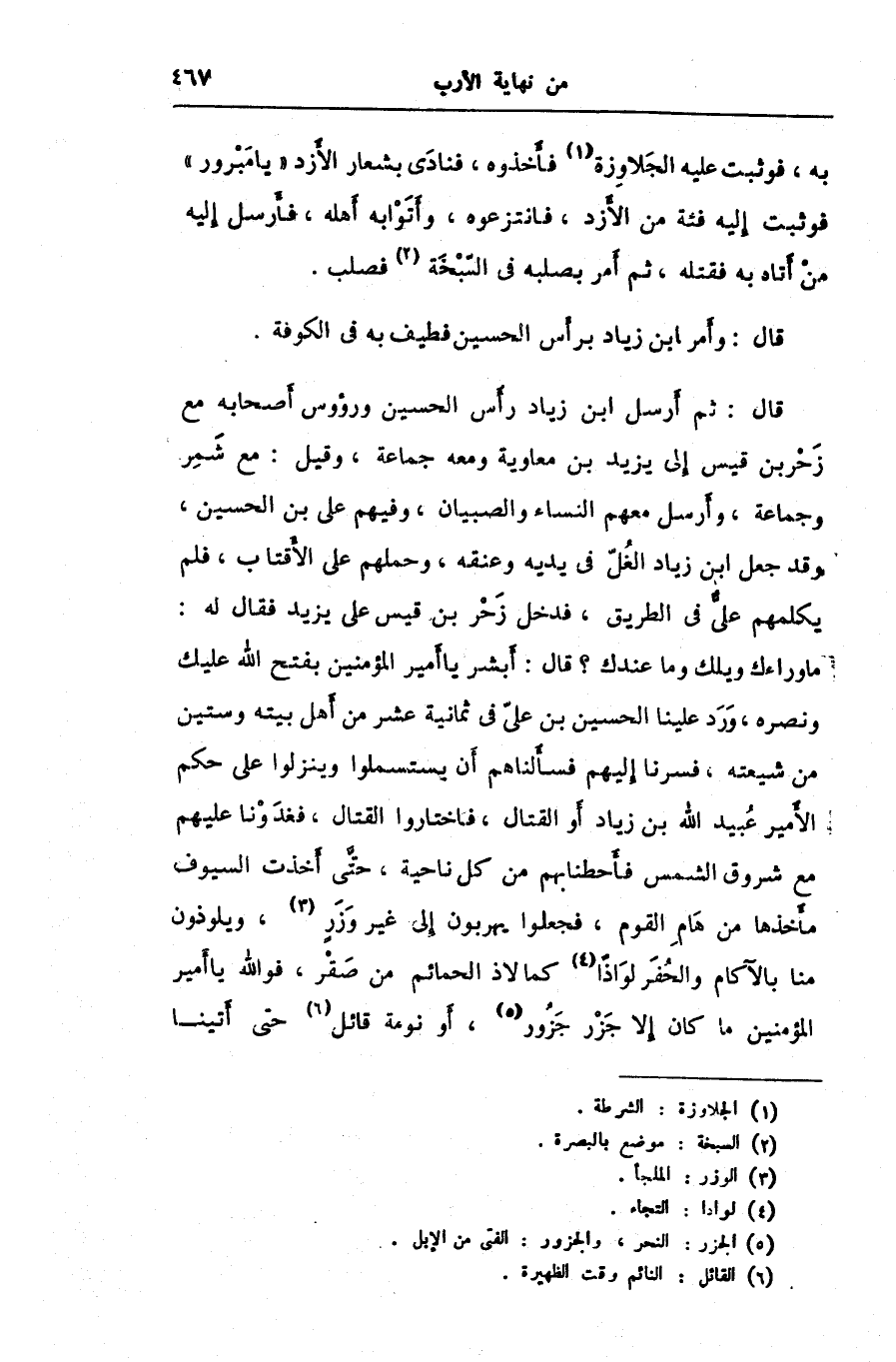 ما وراءك ويلك وما عندك؟ قال: أبشر يا أمير المؤمنين بفتح الله عليك ونصره، ورد علينا الحسين بن علىّ فى ثمانية عشر من أهل بيته وستين من شيعته، فسرنا إليهم فسألناهم أن يستسملوا وينزلوا على حكم الأمير عبيد الله بن زياد أو القتال، فاختاروا القتال، فغدونا عليهم مع شروق الشمس فأحطنا بهم من كل ناحية، حتّى أخذت السيوف مأخذها من هام القوم، فجعلوا يهربون إلى غير وزر [3] ، ويلوذون منا بالآكام والحفر لو اذا [4] كما لاذ الحمائم من صقر، فو الله يا أمير المؤمنين ما كان إلا جزر جزور [5] ، أو نومة قائل [6] حتى أتينا