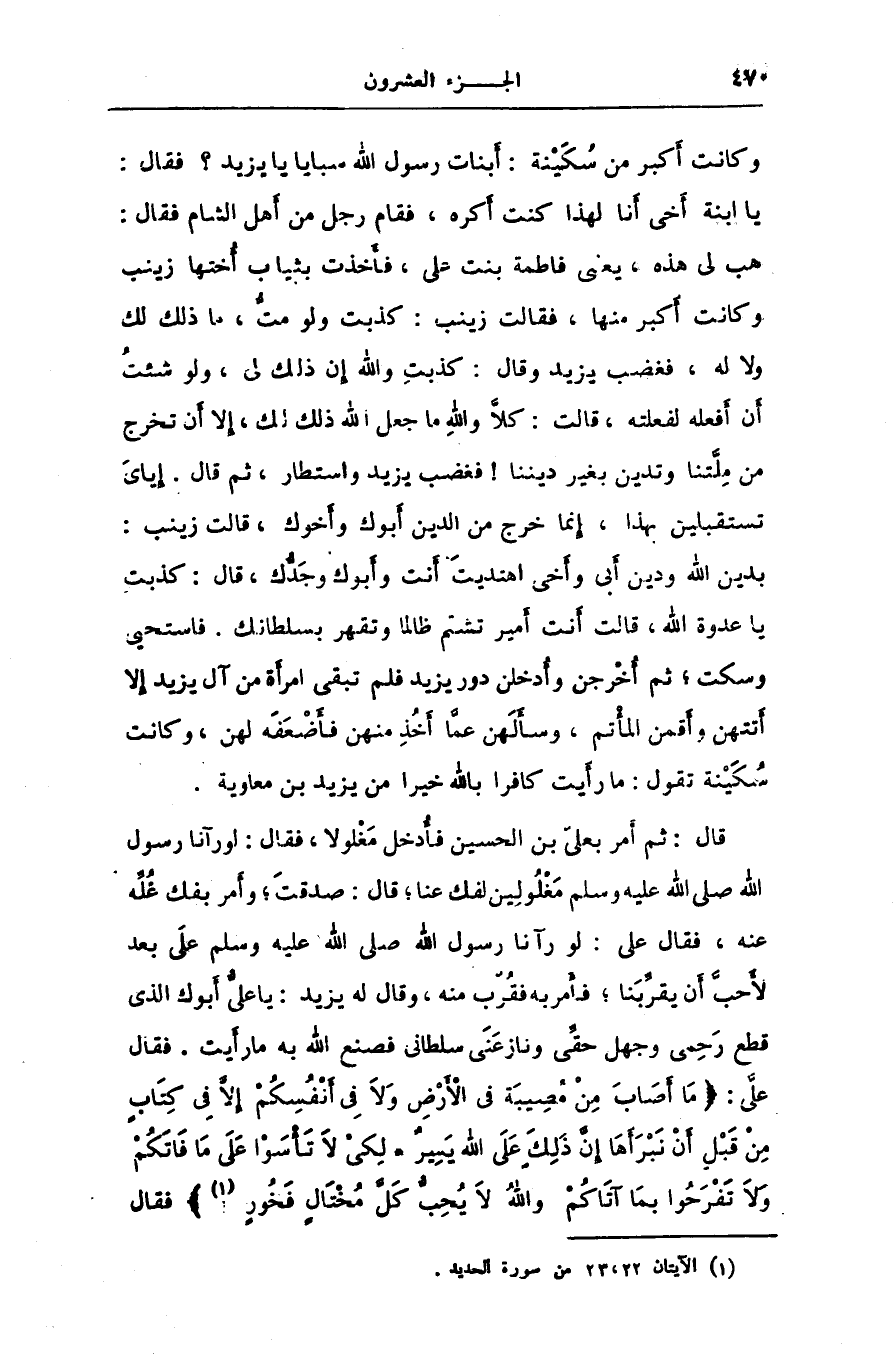 قال: ثم أمر بعلىّ بن الحسين فأدخل مغلولا، فقال: لو رآنا رسول الله صلى الله عليه وسلم مغلولين لفك عنا؛ قال: صدقت؛ وأمر بفك غلّه عنه، فقال على: لو رآنا رسول الله صلى الله عليه وسلم على بعد لأحبّ أن يقرّبنا؛ فأمر به فقرّب منه، وقال له يزيد: يا علىّ أبوك الذى قطع رحمى وجهل حقّى ونازعنى سلطانى فصنع الله به ما رأيت. فقال علىّ: ما أَصابَ مِنْ مُصِيبَةٍ فِي الْأَرْضِ وَلا فِي أَنْفُسِكُمْ إِلَّا فِي كِتابٍ مِنْ قَبْلِ أَنْ نَبْرَأَها إِنَّ ذلِكَ عَلَى اللَّهِ يَسِيرٌ. لِكَيْلا تَأْسَوْا عَلى ما فاتَكُمْ وَلا تَفْرَحُوا بِما آتاكُمْ وَاللَّهُ لا يُحِبُّ كُلَّ مُخْتالٍ فَخُورٍ [1]