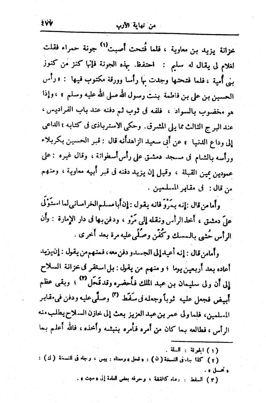وأما من قال: إنه أعيد إلى الجسد ودفن معه، فمنهم من يقول: إن يزيد أعاده بعد أربعين يوما؛ ومنهم من يقول: بل استقر فى خزانة السلاح إلى أن ولى سليمان بن عبد الملك فأحضره وقد قحل [2] ؛ وبقى عظم أبيض فجعل عليه ثوبا وجعله فى سفط [3] وصلّى عليه ودفن فى مقابر المسلمين، فلما ولى عمر بن عبد العزيز بعث إلى خازن السلاح يطلب منه الرأس، فطالعه بما كان من أمره فأمره بنبشه وأخذه، فالله أعلم بما