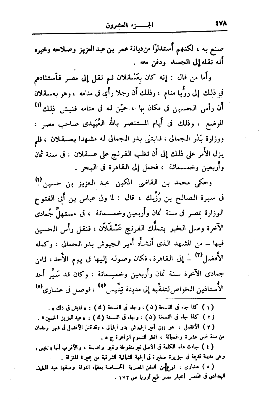 وحكى محمد بن القاضى المكين عبد العزيز بن حسين [2] فى سيرة الصالح بن رزّيك، قال: لما ولى عباس بن أبى الفتوح الوزارة بمصر فى سنة ثمان وأربعين وخمسمائة، فى مستهلّ جمادى الآخرة وصل الخبر بتملّك الفرنج عسقلان، فنقل رأس الحسين فيها- من المشهد الذى أنشأه أمير الجيوش بدر الجمالى، وكمله الأفضل [3]- إلى القاهرة، فكان وصوله إليها فى يوم الأحد، ثامن جمادى الآخرة سنة ثمان وأربعين وخمسمائة، وكان قد سيّر أحد الأستاذين الخواص لتلقّيه إلى مدينة تنّيس [4] ، فوصل فى عشارى [5]