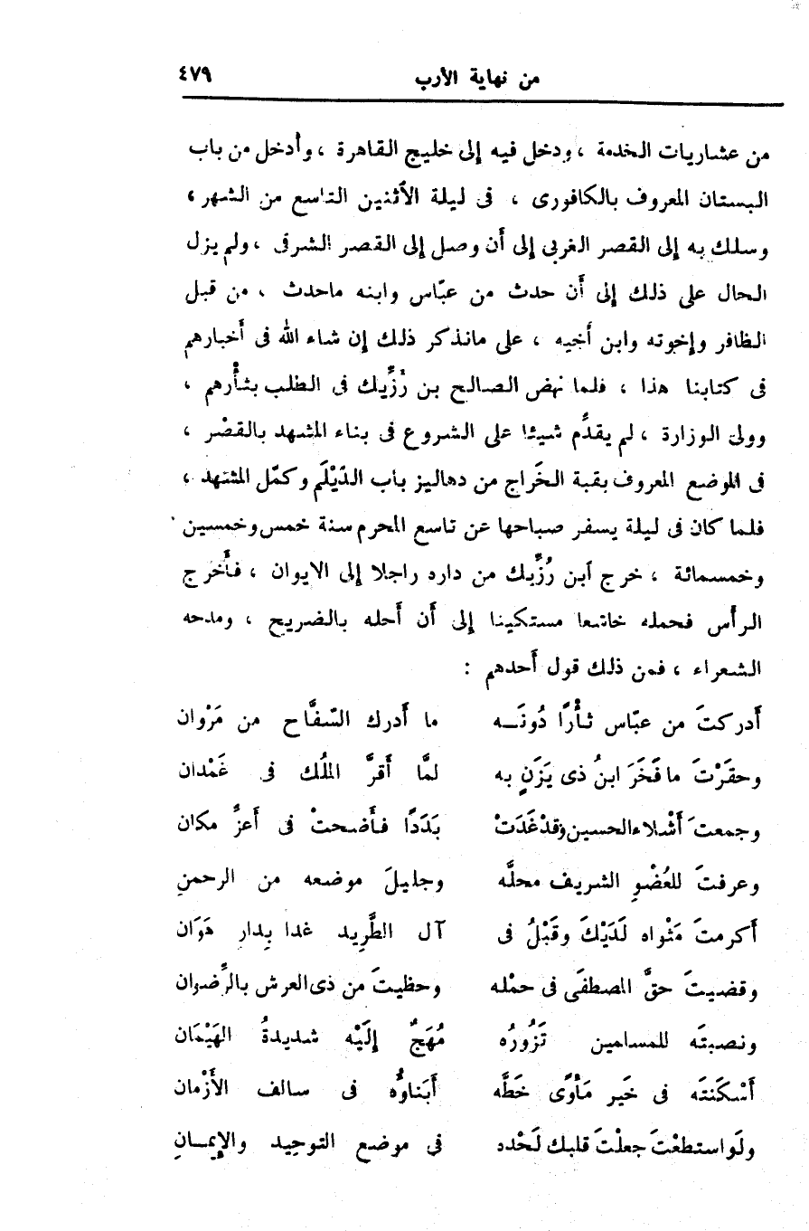 من عشاريات الخدمة، ودخل فيه إلى خليج القاهرة، وأدخل من باب البستان المعروف بالكافورى، فى ليلة الاثنين التاسع من الشهر، وسلك به إلى القصر الغربى إلى أن وصل إلى القصر الشرقى، ولم يزل الحال على ذلك إلى أن حدث من عبّاس وابنه ما حدث، من قبل الظافر وإخوته وابن أخيه، على ما نذكر ذلك إن شاء الله فى أخبارهم فى كتابنا هذا، فلما نهض الصالح بن رزّيك فى الطلب بثأرهم، وولىّ الوزارة، لم يقدّم شيئا على الشروع فى بناء المشهد بالقصر، فى الموضع المعروف بقبة الخراج من دهاليز باب الديلم وكمّل المشهد، فلما كان فى ليلة يسفر صباحها عن تاسع المحرم سنة خمس وخمسين وخمسمائة، خرج ابن رزّيك من داره راجلا إلى الايوان، فأخرج الرأس فحمله خاشعا مستكينا إلى أن أحله بالضريح، ومدحه الشعراء، فمن ذلك قول أحدهم: