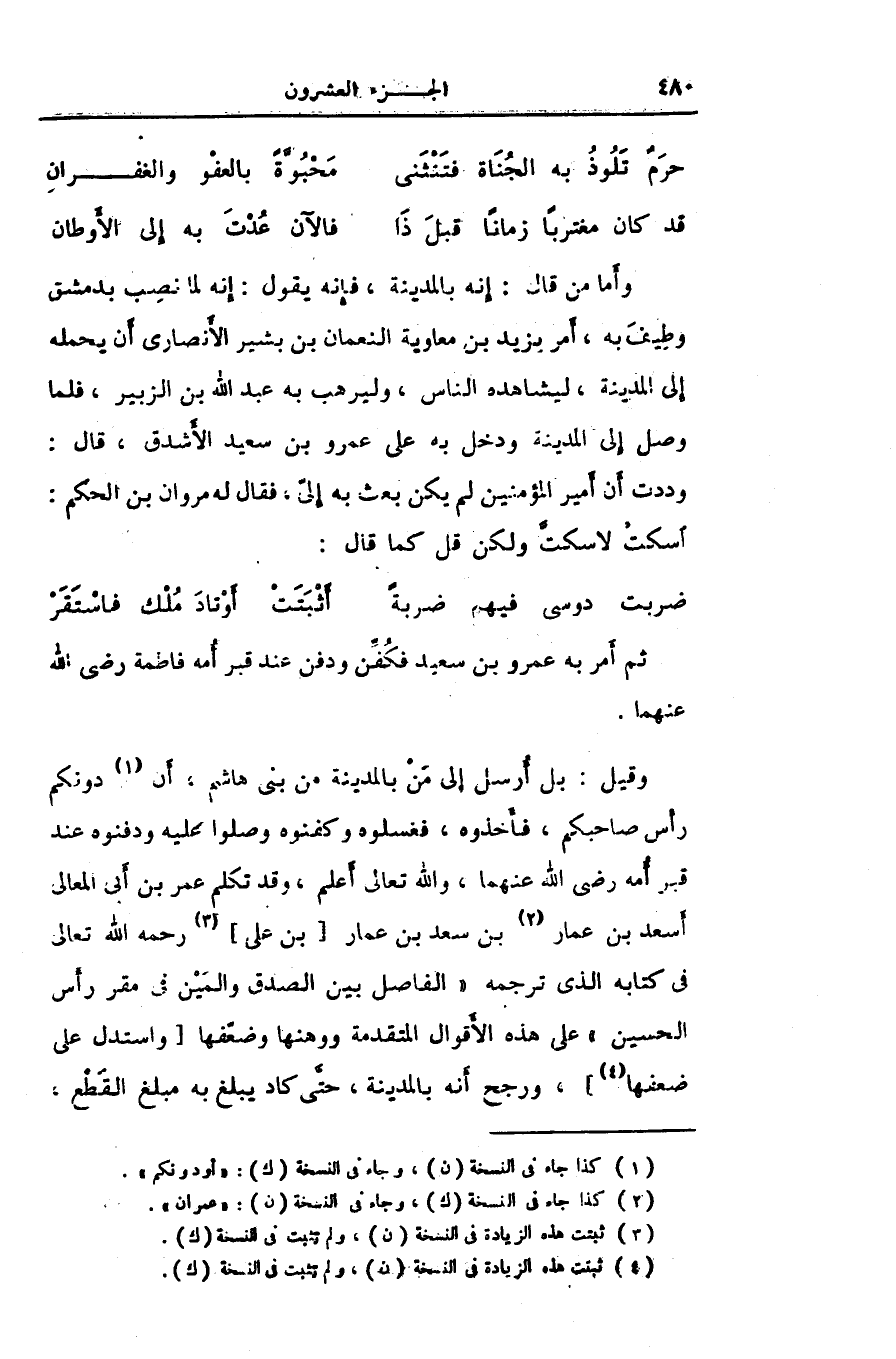 وقيل: بل أرسل إلى من بالمدينة من بنى هاشم، أن [1] دونكم رأس صاحبكم، فأخذوه، فغسلوه وكفنوه وصلوا عليه ودفنوه عند قبر أمه رضى الله عنهما، والله تعالى أعلم، وقد تكلم عمر بن أبى المعالى أسعد بن عمار [2] بن سعد بن عمار [بن على] [3] رحمه الله تعالى فى كتابه الذى ترجمه «الفاصل بين الصدق والمين فى مقر رأس الحسين» على هذه الأقوال المتقدمة ووهنها وضعّفها [واستدل على ضعفها [4]] ، ورجح أنه بالمدينة، حتّى كاد يبلغ به مبلغ القطع،