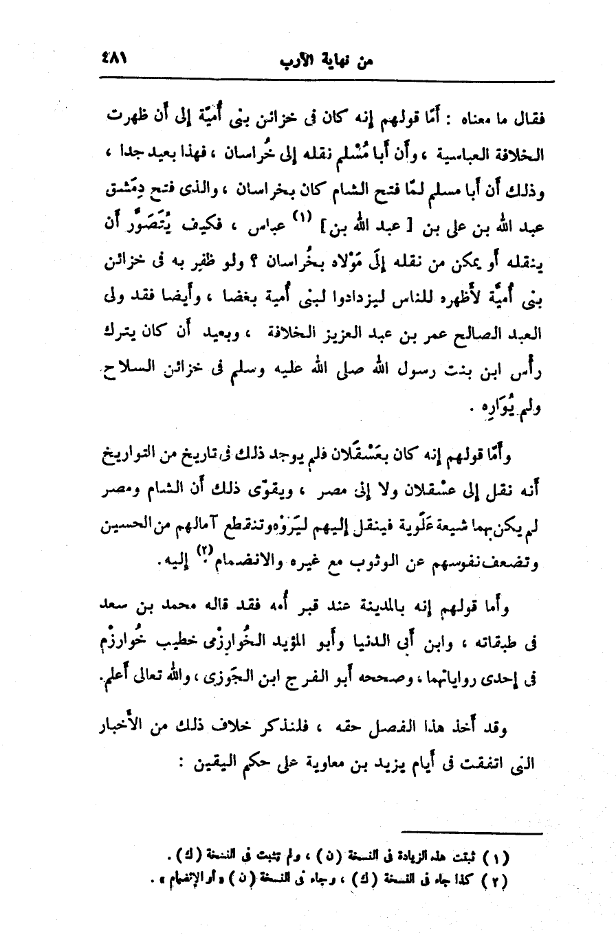 فقال ما معناه: أمّا قولهم إنه كان فى خزائن بنى أميّة إلى أن ظهرت الخلافة العباسية، وأن أبا مسلم نقله إلى خراسان، فهذا بعيد جدا، وذلك أن أبا مسلم لمّا فتح الشام كان بخراسان، والذى فتح دمشق عبد الله بن على بن [عبد الله بن] [1] عباس، فكيف يتصوّر أن ينقله أو يمكن من نقله إلى مولاه بخراسان؟ ولو ظفر به فى خزائن بنى أميّة لأظهره للناس ليزدادوا لبنى أمية بغضا، وأيضا فقد ولى العبد الصالح عمر بن عبد العزيز الخلافة، وبعيد أن كان يترك رأس ابن بنت رسول الله صلى الله عليه وسلم فى خزائن السلاح ولم يواره.