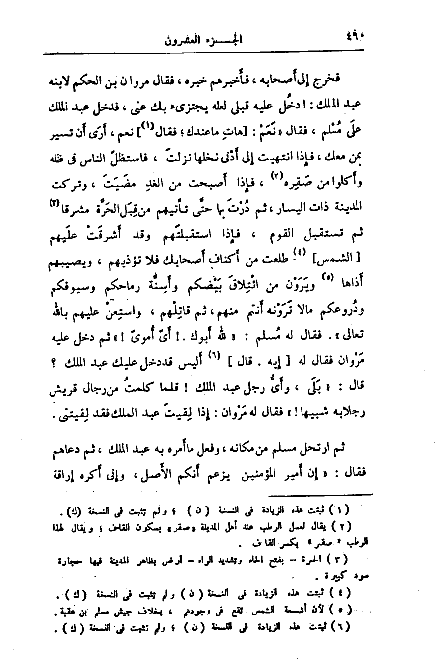 فخرج إلى أصحابه، فأخبرهم خبره، فقال مروان بن الحكم لابنه عبد الملك: ادخل عليه قبلى لعله يجتزىء بك عنى، فدخل عبد الملك على مسلم، فقال «نعم: [هات ما عندك؛ فقال [1]] نعم، أرى أن تسير بمن معك، فإذا انتهيت إلى أدنى نخلها نزلت، فاستظلّ الناس فى ظله وأكلوا من صقره [2] ، فإذا أصبحت من الغد مضيت، وتركت المدينة ذات اليسار، ثم درت بها حتّى تأتيهم من قبل الحرّة مشرقا [3] ثم تستقبل القوم، فإذا استقبلتهم وقد أشرقت عليهم [الشمس] [4] طلعت من أكناف أصحابك فلا تؤذيهم، ويصيبهم أذاها [5] ويرون من ائتلاق بيضكم وأسنّة رماحكم وسيوفكم ودروعكم ما لا ترونه أنتم منهم، ثم قاتلهم، واستعن عليهم بالله تعالى» . فقال له مسلم: «لله أبوك.! أىّ أموىّ!» ثم دخل عليه مروان فقال له [إيه. قال] [6] أليس قد دخل عليك عبد الملك؟