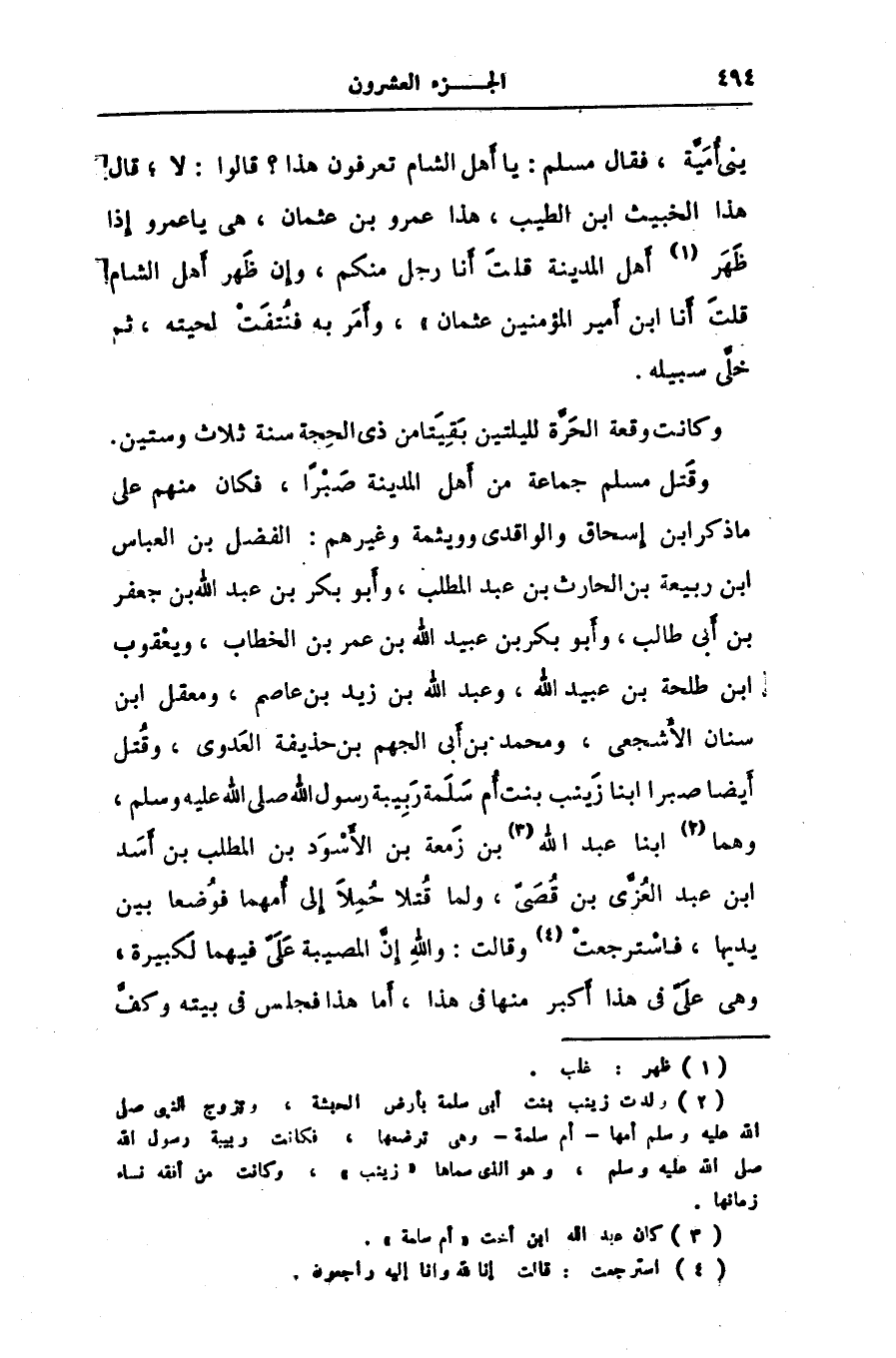 وقتل مسلم جماعة من أهل المدينة صبرا، فكان منهم على ما ذكر ابن إسحاق والواقدى وويثمة وغيرهم: الفضل بن العباس ابن ربيعة بن الحارث بن عبد المطلب، وأبو بكر بن عبد الله بن جعفر بن أبى طالب، وأبو بكر بن عبيد الله بن عمر بن الخطاب، ويعقوب ابن طلحة بن عبيد الله، وعبد الله بن زيد بن عاصم، ومعقل ابن سنان الأشجعى، ومحمد بن أبى الجهم بن حذيفة العدوى، وقتل أيضا صبرا ابنا زينب بنت أم سلمة ربيبة رسول الله صلى الله عليه وسلم، وهما [2] ابنا عبد الله [3] بن زمعة بن الأسود بن المطلب بن أسد ابن عبد العزّى بن قصىّ، ولما قتلا حملا إلى أمهما فوضعا بين يديها، فاسترجعت [4] وقالت: والله إنّ المصيبة علىّ فيهما لكبيرة، وهى علىّ فى هذا أكبر منها فى هذا، أما هذا فجلس فى بيته وكفّ