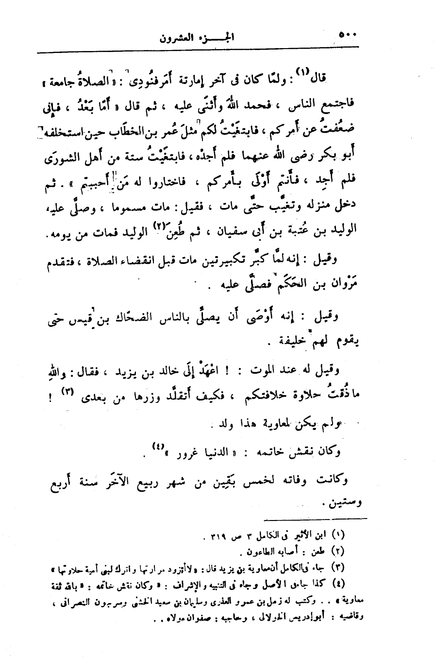 قال [1] : ولمّا كان فى آخر إمارتة أمر فنودى: «الصلاة جامعة» فاجتمع الناس، فحمد الله وأثنى عليه، ثم قال «أمّا بعد، فإنى ضعفت عن أمركم، فابتغيت لكم مثل عمر بن الخطاب حين استخلفه أبو بكر رضى الله عنهما فلم أجده، فابتغيت ستة من أهل الشورى فلم أجد، فأنتم أولى بأمركم، فاختاروا له من أحببتم» . ثم دخل منزله وتغيّب حتّى مات، فقيل: مات مسموما، وصلّى عليه الوليد بن عتبة بن أبى سفيان، ثم طعن [2] الوليد فمات من يومه.