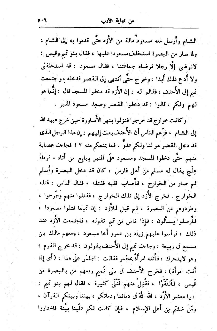 لا نرضى إلّا رجلا ترضاه جماعتنا، فقال مسعود: قد استخلفنى ولا أدع ذلك أبدا، وخرج حتّى انتهى إلى القصر فدخله، واجتمعت نميم إلى الأحنف، فقالوا له: إن الأزد قد دخلوا المسجد قال: إنّما هو لهم ولكم، قالوا: قد دخلوا القصر وصعد مسعود المنبر.