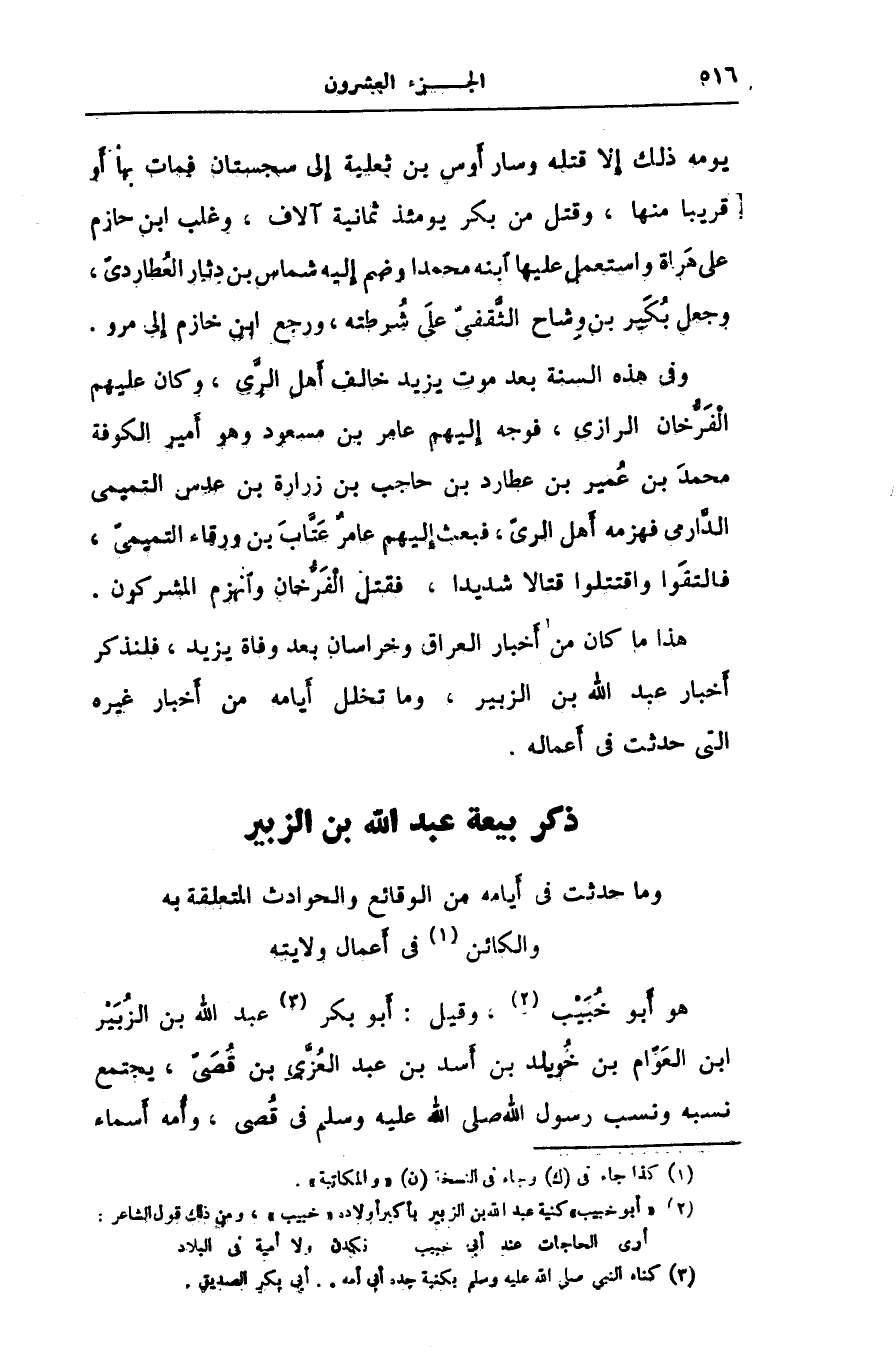 ذكر بيعة عبد الله بن الزبير وما حدثت فى أيامه من الوقائع والحوادث المتعلقة به والكائن [1] فى أعمال ولايته
