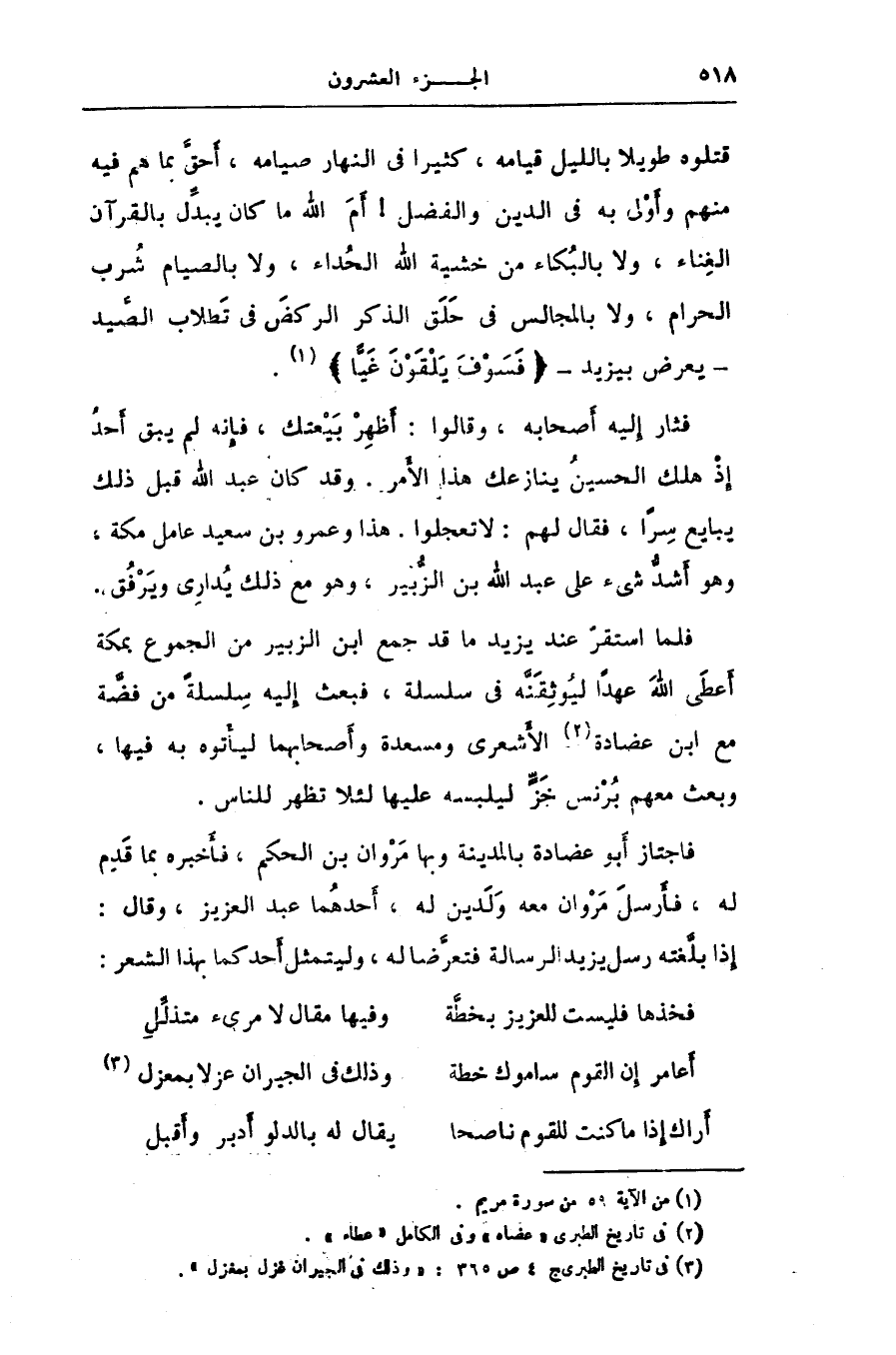 قتلوه طويلا بالليل قيامه، كثيرا فى النهار صيامه، أحقّ بما هم فيه منهم وأولى به فى الدين والفضل! أم الله ما كان يبدّل بالقرآن الغناء، ولا بالبكاء من خشية الله الحداء، ولا بالصيام شرب الحرام، ولا بالمجالس فى حلق الذكر الركض فى تطلاب الصّيد- يعرض بيزيد فَسَوْفَ يَلْقَوْنَ غَيًّا