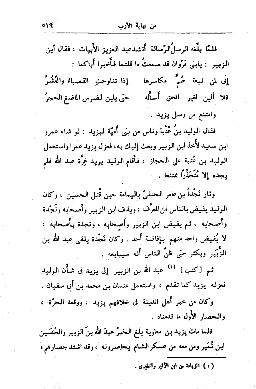 فلمّا بلّغه الرسل الرّسالة أنشد عبد العزيز الأبيات، فقال ابن الزبير: يا بنى مروان قد سمعت ما قلتما فأخبرا أباكما: