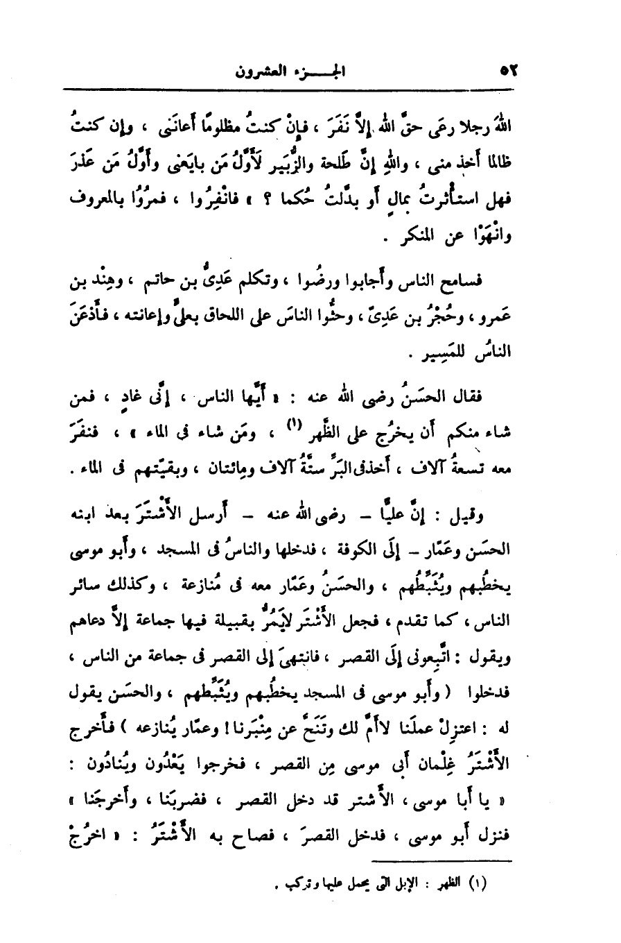 الله رجلا رعى حقّ الله إلّا نفر، فإن كنت مظلوما أعاننى، وإن كنت ظالما أخذ منى، والله إنّ طلحة والزّبير لأوّل من بايعنى وأوّل من عذر فهل استأثرت بمال أو بدّلت حكما؟» فانفروا، فمروا بالمعروف وانهوا عن المنكر.