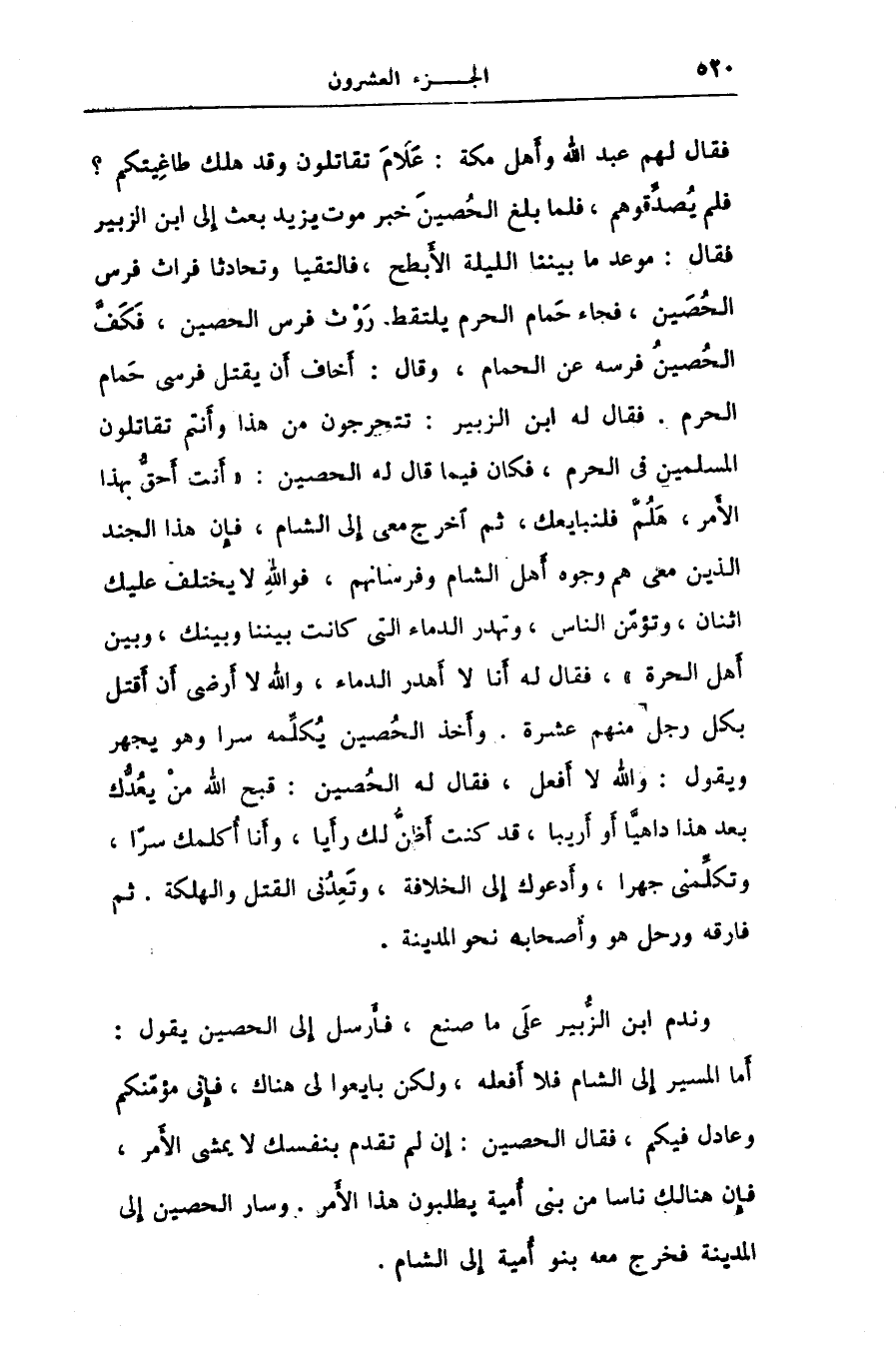 فلم يصدّقوهم، فلما بلغ الحصين خبر موت يزيد بعث إلى ابن الزبير فقال: موعد ما بيننا الليلة الأبطح، فالتقيا وتحادثا فراث فرس الحصين، فجاء حمام الحرم يلتقط روث فرس الحصين، فكفّ الحصين فرسه عن الحمام، وقال: أخاف أن يقتل فرسى حمام الحرم. فقال له ابن الزبير: تتحرجون من هذا وأنتم تقاتلون المسلمين فى الحرم، فكان فيما قال له الحصين: «أنت أحقّ بهذا الأمر، هلمّ فلنبايعك، ثم اخرج معى إلى الشام، فإن هذا الجند الذين معى هم وجوه أهل الشام وفرسانهم، فو الله لا يختلف عليك اثنان، وتؤمّن الناس، وتهدر الدماء التى كانت بيننا وبينك، وبين أهل الحرة» ، فقال له أنا لا أهدر الدماء، والله لا أرضى أن أقتل بكل رجل منهم عشرة. وأخذ الحصين يكلّمه سرا وهو يجهر ويقول: والله لا أفعل، فقال له الحصين: قبح الله من يعدّك بعد هذا داهيّا أو أريبا، قد كنت أظنّ لك رأيا، وأنا أكلمك سرّا، وتكلّمنى جهرا، وأدعوك إلى الخلافة، وتعدنى القتل والهلكة. ثم فارقه ورحل هو وأصحابه نحو المدينة.