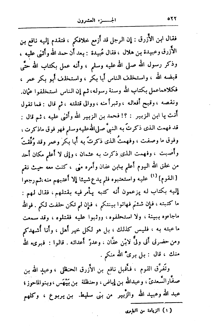 فقال ابن الأزرق: إن الرجل قد أزمع خلافكم، فتقدم إليه نافع بن الأزرق وعبيدة بن هلال، فقال عبيدة: بعد أن حمد الله وأثنى عليه، وذكر رسول الله صلى الله عليه وسلم، وأنه عمل بكتاب الله حتّى قبضه الله، واستخلف الناس أبا بكر، واستخلف أبو بكر عمر، فكلاهما عمل بكتاب الله وسنة رسوله، ثم إن الناس استخلفوا عثمان.