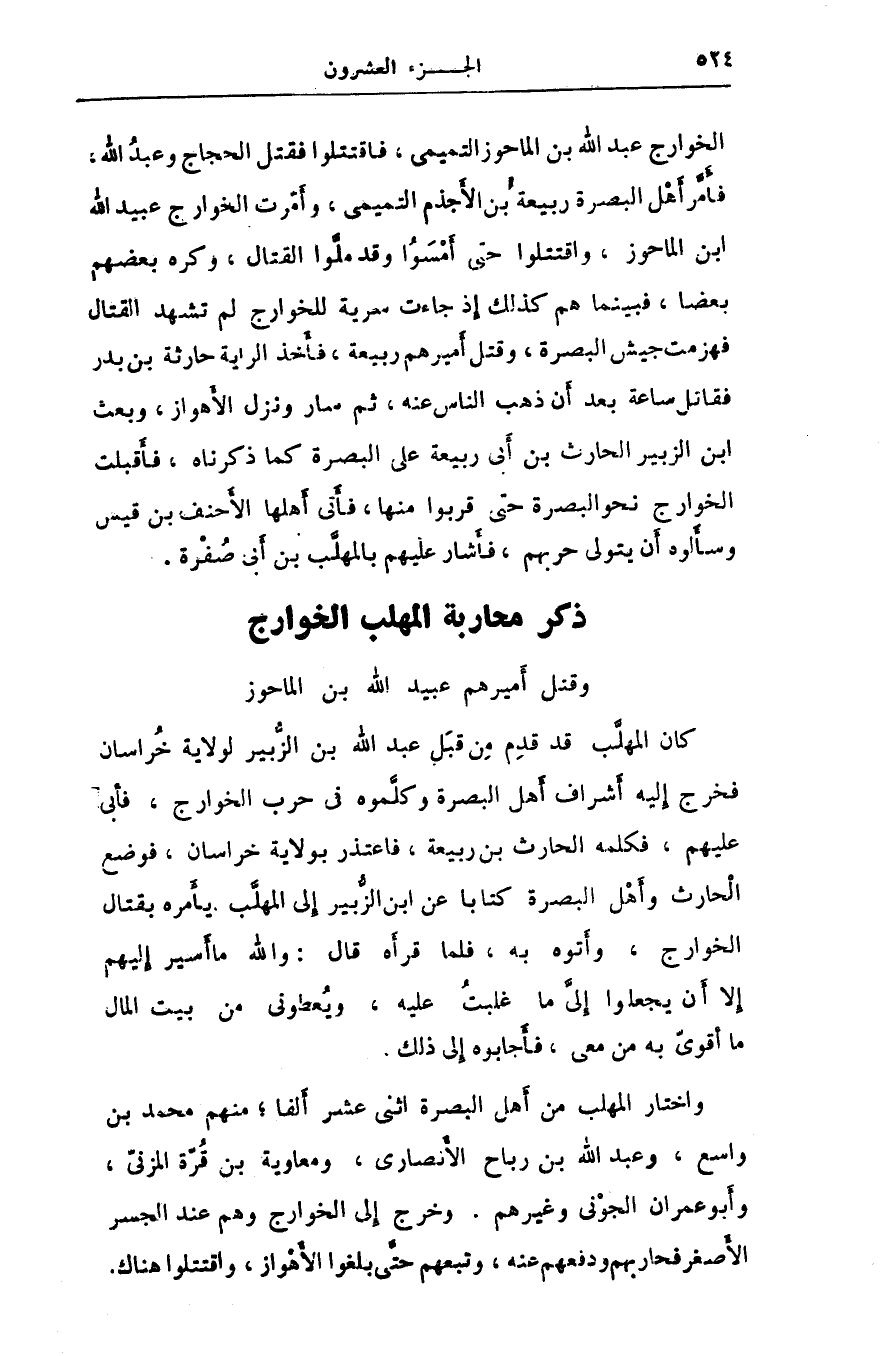 الخوارج عبد الله بن الماحوز التميمى، فاقتتلوا فقتل الحجاج وعبد الله، فأمّر أهل البصرة ربيعة بن الأجذام التميمى، وأمّرت الخوارج عبيد الله ابن الماحوز، واقتتلوا حتى أمسوا وقد ملّوا القتال، وكره بعضهم بعضا، فبينما هم كذلك إذ جاءت سرية للخوارج لم تشهد القتال فهزمت جيش البصرة، وقتل أميرهم ربيعة، فأخذ الراية حارثة بن بدر فقاتل ساعة بعد أن ذهب الناس عنه، ثم سار ونزل الأهواز، وبعث ابن الزبير الحارث بن أبى ربيعة على البصرة كما ذكرناه، فأقبلت الخوارج نحو البصرة حتى قربوا منها، فأتى أهلها الأحنف بن قيس وسألوه أن يتولى حربهم، فأشار عليهم بالمهلّب بن أبى صفرة.