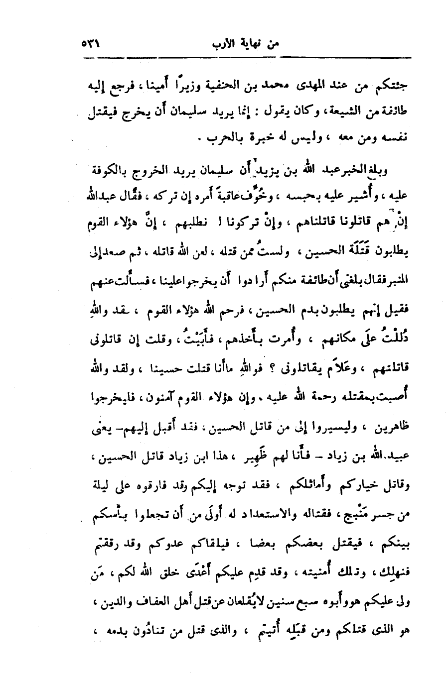 وبلغ الخبر عبد الله بن يزيد أن سليمان يريد الخروج بالكوفة عليه، وأشير عليه بحبسه، وخوّف عاقبة أمره إن تركه، فقال عبد الله إن هم قاتلونا قاتلناهم، وإن تركونا؟؟؟ لنطلبهم، إنّ هؤلاء القوم يطلبون قتلة الحسين، ولست ممن قتله، لعن الله قاتله، ثم صعد إلى المنبر فقال بلغنى أن طائفة منكم أرادوا أن يخرجوا علينا، فسألت عنهم فقيل إنهم يطلبون بدم الحسين، فرحم الله هؤلاء القوم، لقد والله دللت على مكانهم، وأمرت بأخذهم، فأبيت، وقلت إن قاتلونى قاتلتهم، وعلام يقاتلونى؟ فو الله ما أنا قتلت حسينا، ولقد والله أصبت بمقتله رحمة الله عليه، وإن هؤلاء القوم آمنون، فليخرجوا ظاهرين، وليسيروا إلى من قاتل الحسين، فقد أقبل إليهم- يعنى عبيد الله بن زياد- فأنا لهم ظهير، هذا ابن زياد قاتل الحسين، وقاتل خياركم وأماثلكم، فقد توجه إليكم وقد؟؟؟ فارقوه على ليلة من جسر منبج،؟؟؟ فقاتله والاستعداد له أولى من أن تجعلوا بأسكم بينكم، فيقتل بعضكم بعضا،؟؟؟ فليقاكم عدوكم وقد رققتم فنهلك، وتلك أمنيته، وقد قدم عليكم أعدى خلق الله لكم، من ولى عليكم هو وأبوه سبع سنين لا يقلعان عن قتل أهل العفاف والدين، هو الذى قتلكم ومن قبله أتيتم، والذى قتل من تنادون بدمه،