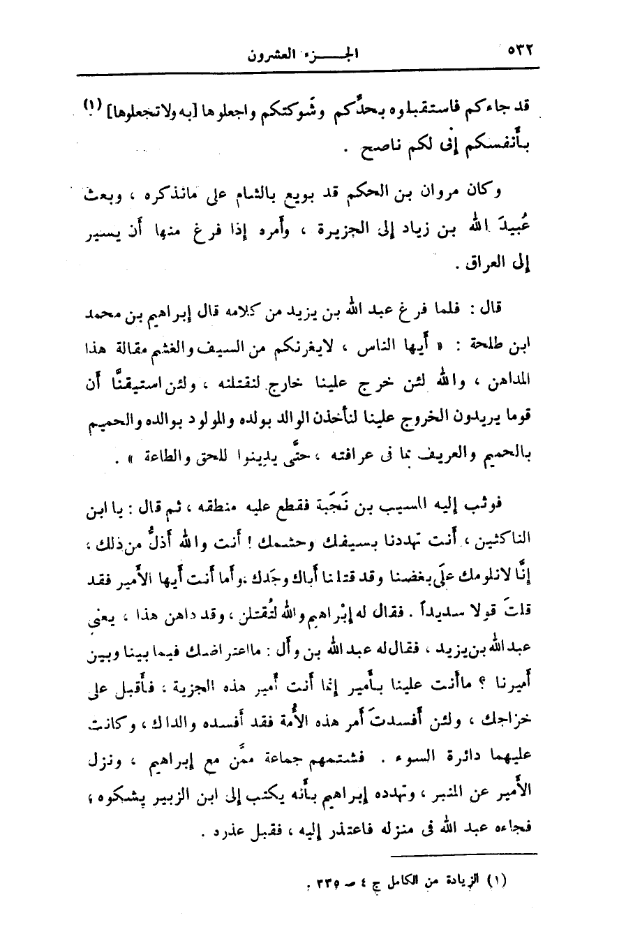 قال: فلما فرغ عبد الله بن يزيد من كلامه قال إبراهيم بن محمد ابن طلحة: «أيها الناس، لا يغرنكم من السيف والغشم مقالة هذا المداهن، والله لئن خرج علينا خارج لنقتلنه، ولئن استيقنّا أن قوما يريدون الخروج علينا لنأخذن الوالد بولده والمولود بوالده والحميم بالحميم والعريف بما فى عرافته، حتّى يدينوا للحق والطاعة» .