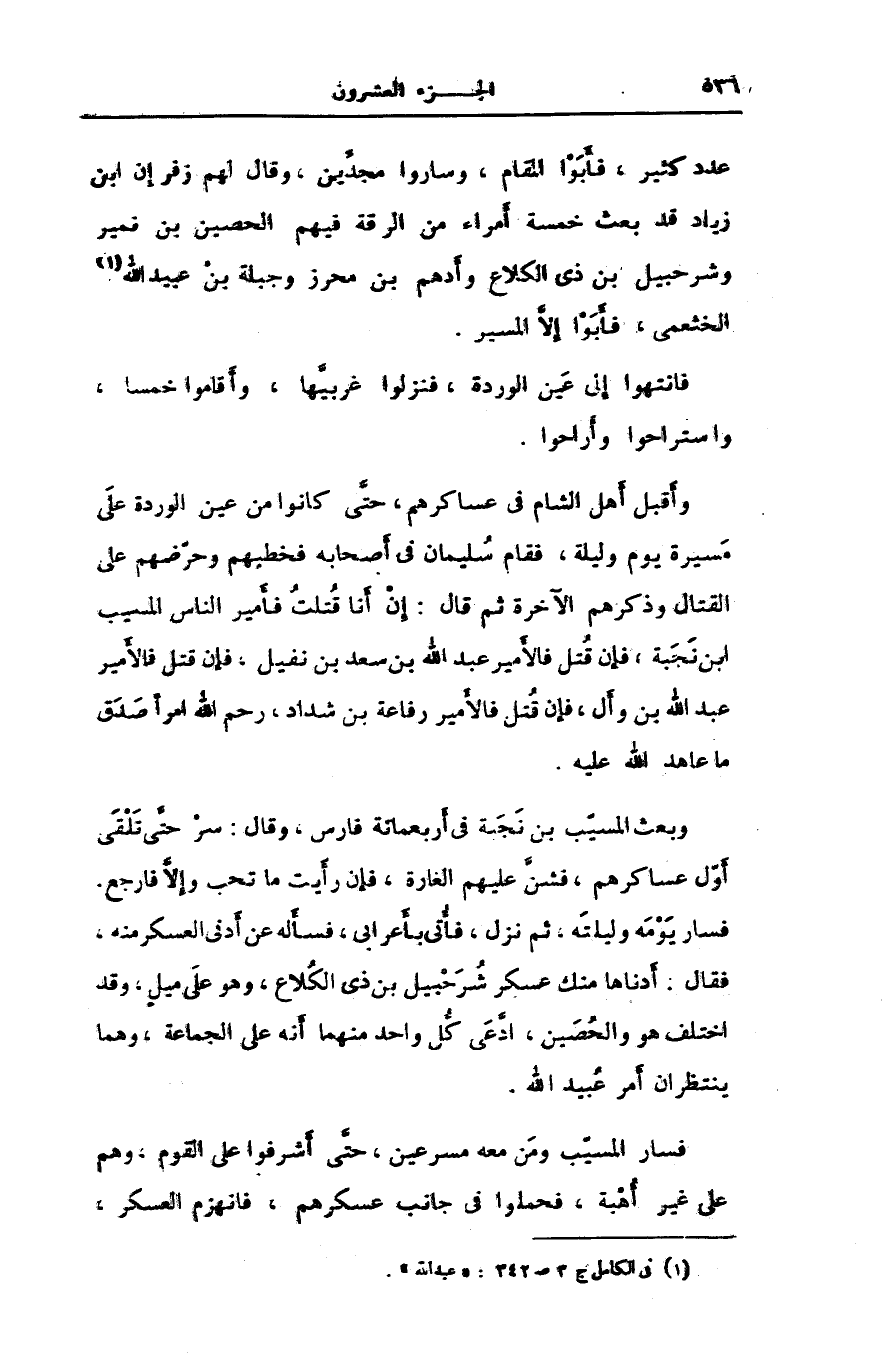 فسار يومه وليلته، ثم نزل، فأتى بأعرابى، فسأله عن أدنى العسكر منه، فقال: أدناها منك عسكر شرحبيل بن ذى الكلاع، وهو على ميل، وقد اختلف هو والحصين، ادّعى كلّ واحد منهما أنه على الجماعة، وهما ينتظران أمر عبيد الله.