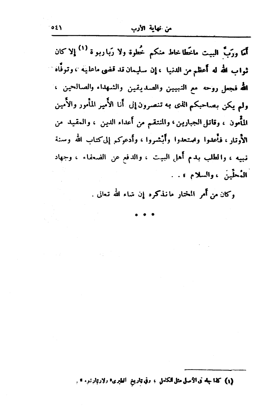 أما وربّ البيت ما خطا خاط منكم خطوة ولا ربا ربوة [1] إلا كان ثواب الله له أعظم من الدنيا، إن سليمان قد قضى ما عليه، وتوفّاه الله فجعل روحه مع النبيين والصديقين والشهداء والصالحين، ولم يكن؟؟؟ بصاحبكم الذى به تنصرون إنى أنا الأمير المأمور والأمين المأمون، وقاتل الجبارين، والمنتقم من أعداء الدين، والمقيد من الأوتار، فأعدوا واستعدوا وأبشروا، وأدعوكم إلى كتاب الله وسنة نبيه، والطلب بدم أهل البيت، والدفع عن الضعفاء، وجهاد المحلّين، والسلام» ..