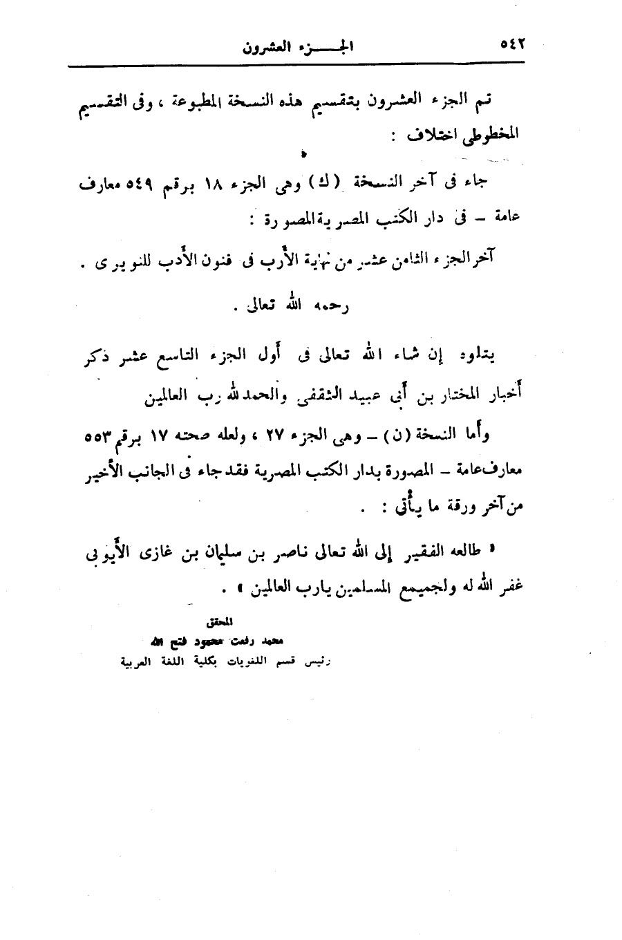 يتلوه إن شاء الله تعالى فى أول الجزء التاسع عشر ذكر أخبار المختار بن أبى عبيد الثقفى والحمد لله رب العالمين وأما النسخة (ن) وهى الجزء 27، ولعله صحته 17 برقم 553 معارف عامة- المصورة بدار الكتب المصرية فقد جاء فى الجانب الأخير من آخر ورقة ما يأتى:.